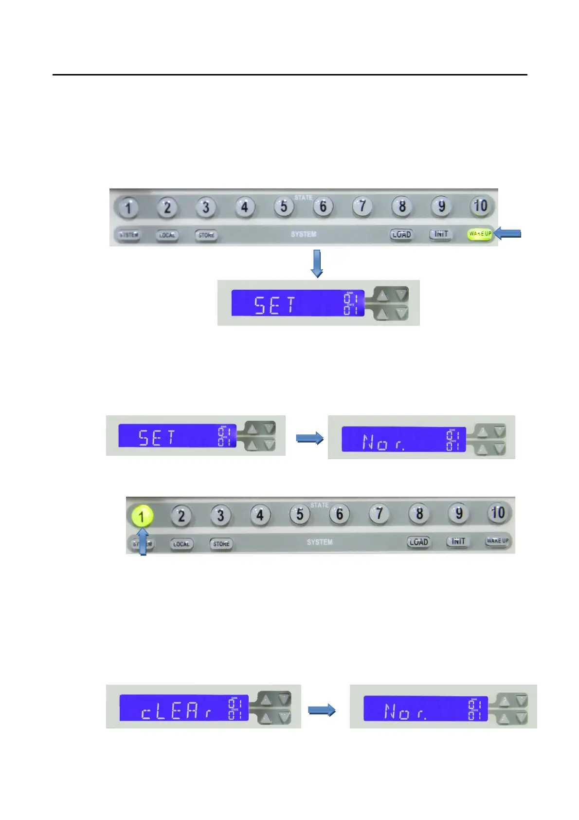 Shows bank 01 state 01. After pressing store key the LCD will revert to the