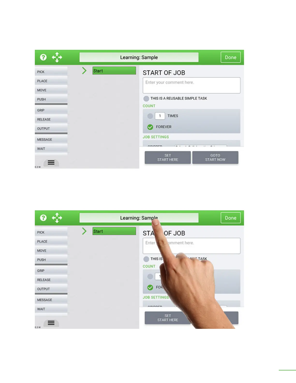 OB7 has not learned anything in this job yet. First, let’s give the job a name. Tap the title bar where it