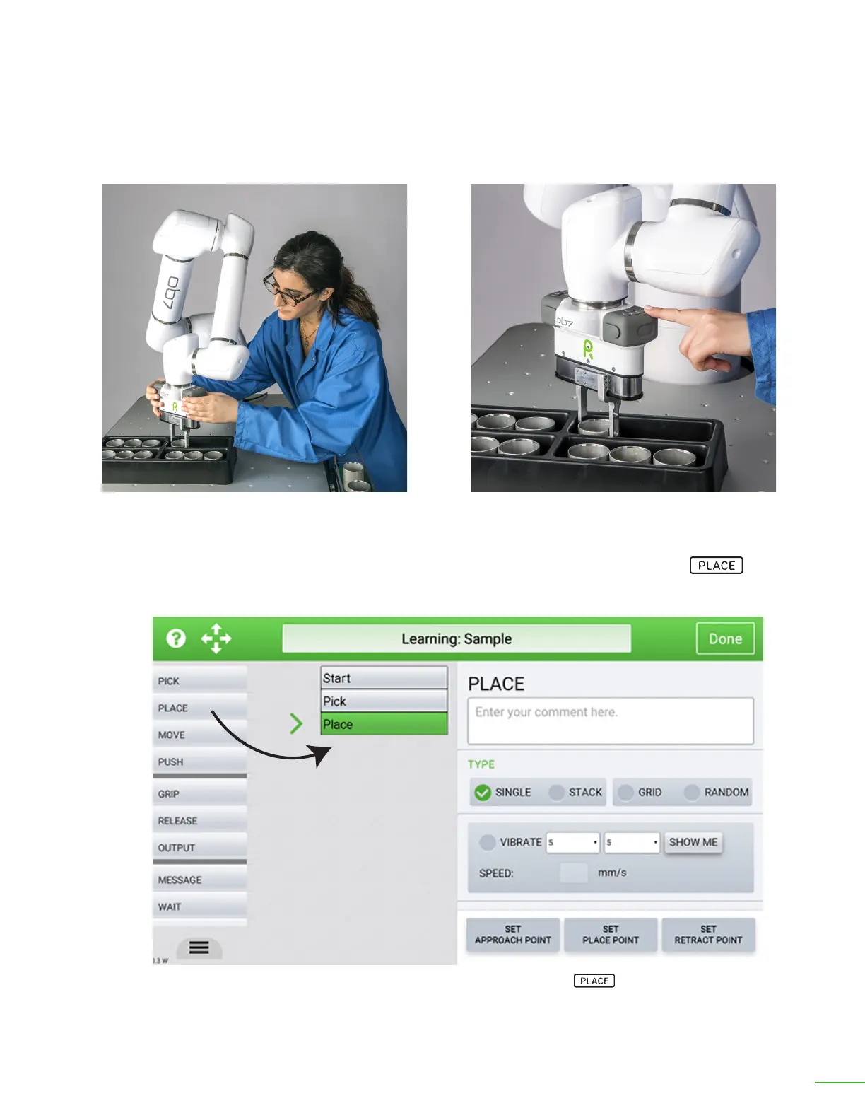 it should be placed. Then, press the ◀|▶ button to open the gripper. OB7 learns where to place the