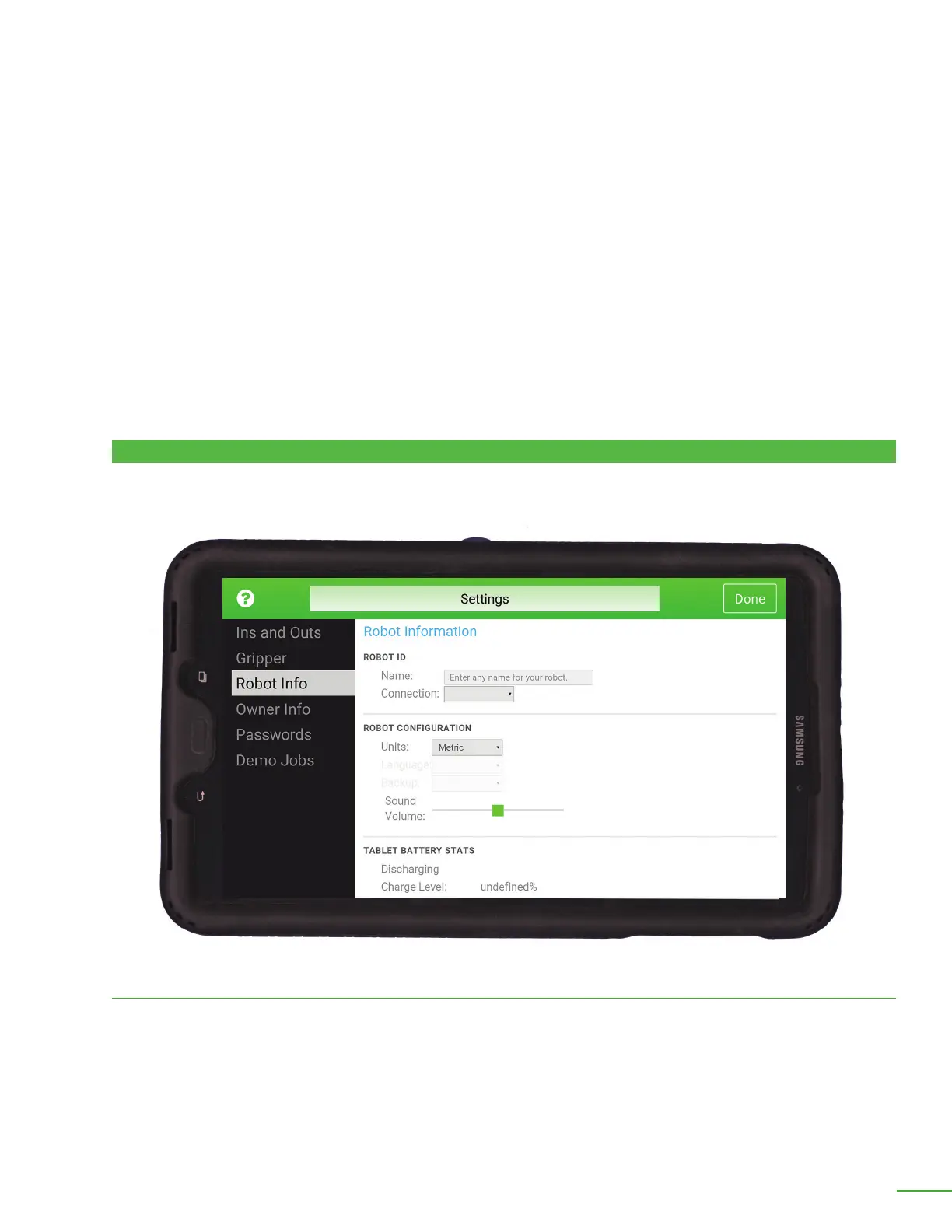 Connection: Select whether the control tablet is connected to the robot with a USB cable or