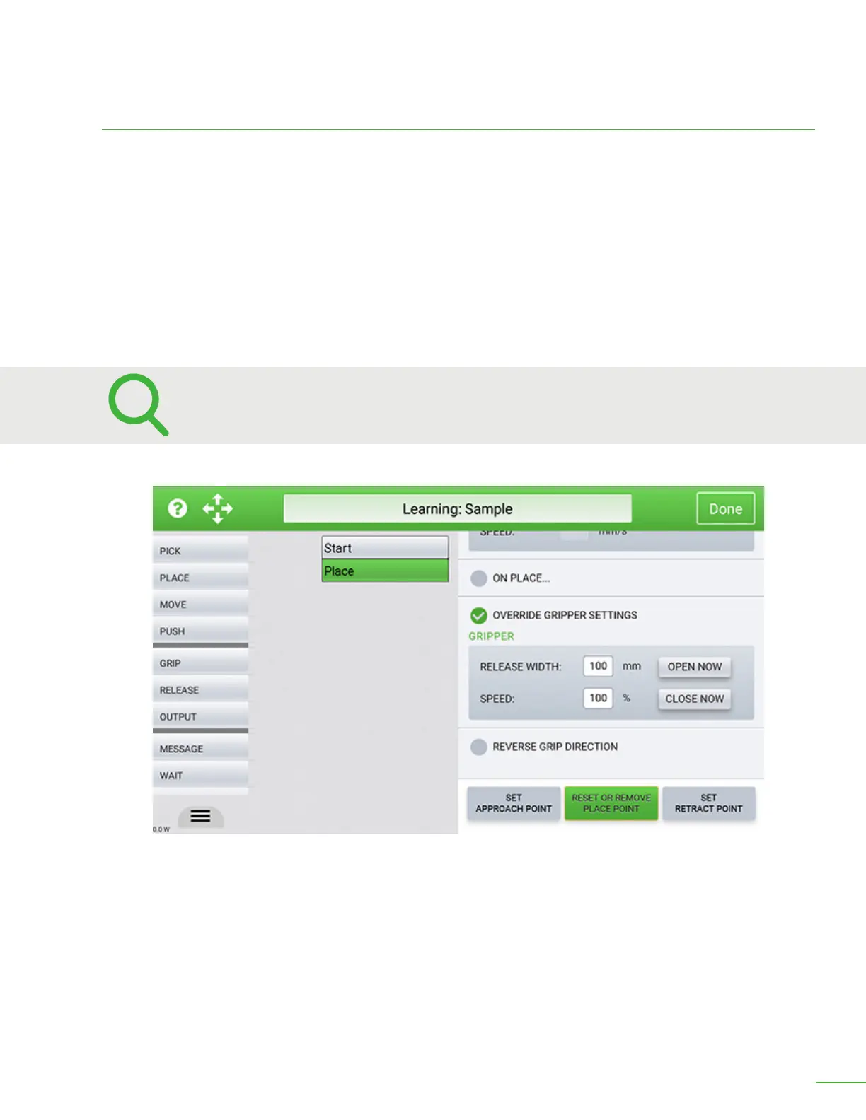 Use the “Override Gripper Settings” to specify the width, speed, and force for picking up delicate objects.