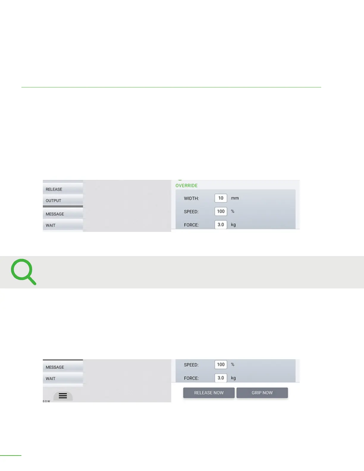 Release Now: This button will cause the gripper to release immediately when pushed. This button is