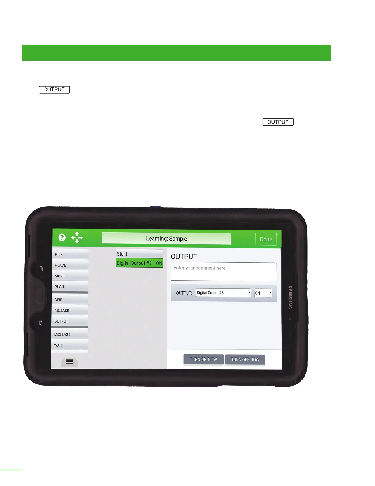The OUTPUT tile is used to tell OB7 to turn on an output signal. The output signal may be used to