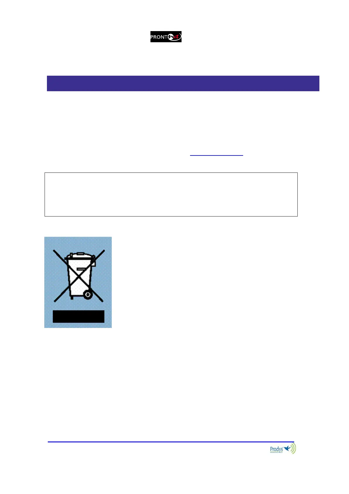 A “Declaration of conformity” for ProntoNet is available on file at Prodys offices in