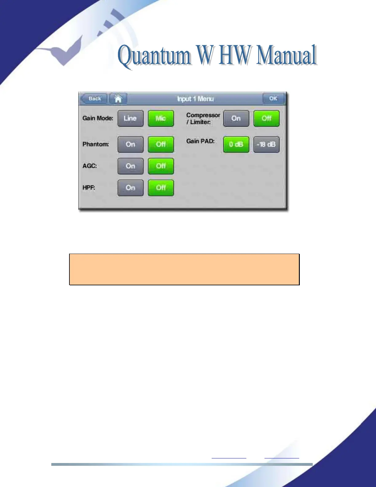 Quantum W web interface. Once the audio input gain setting has been selected