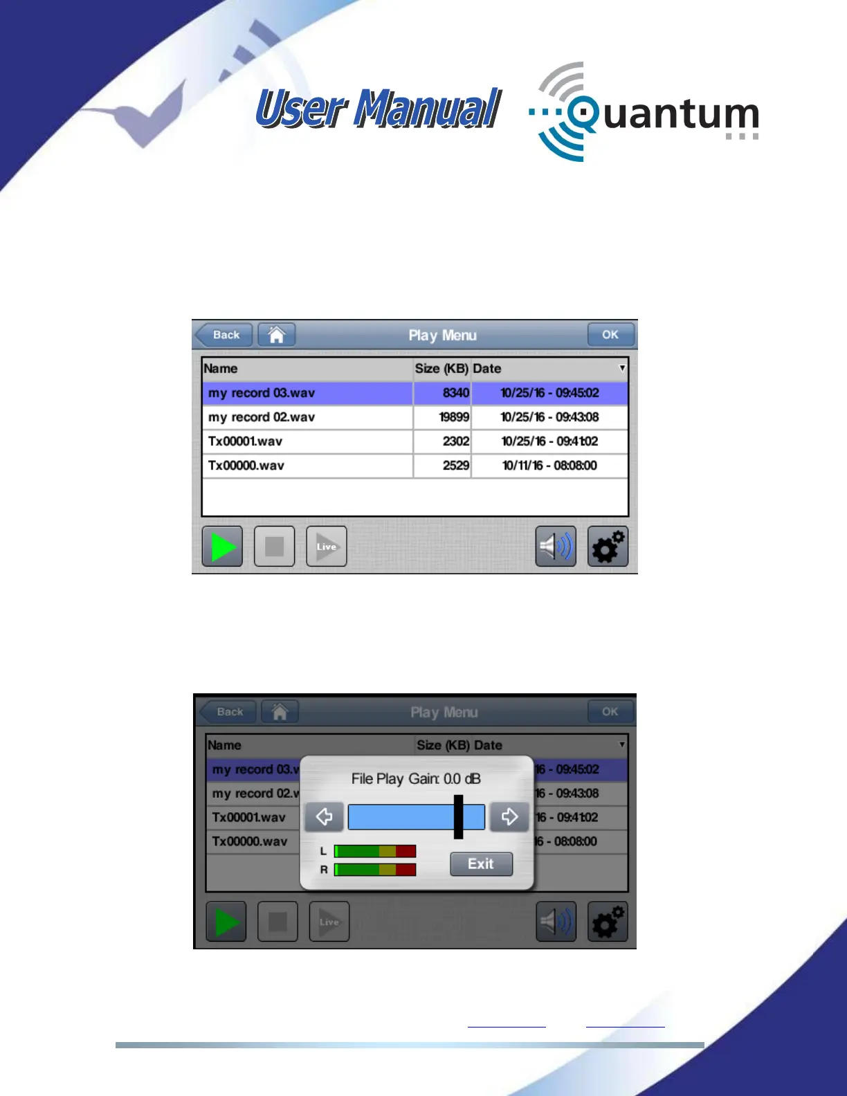 transmission, pressing the play-live button. The gain of the file playback can be
