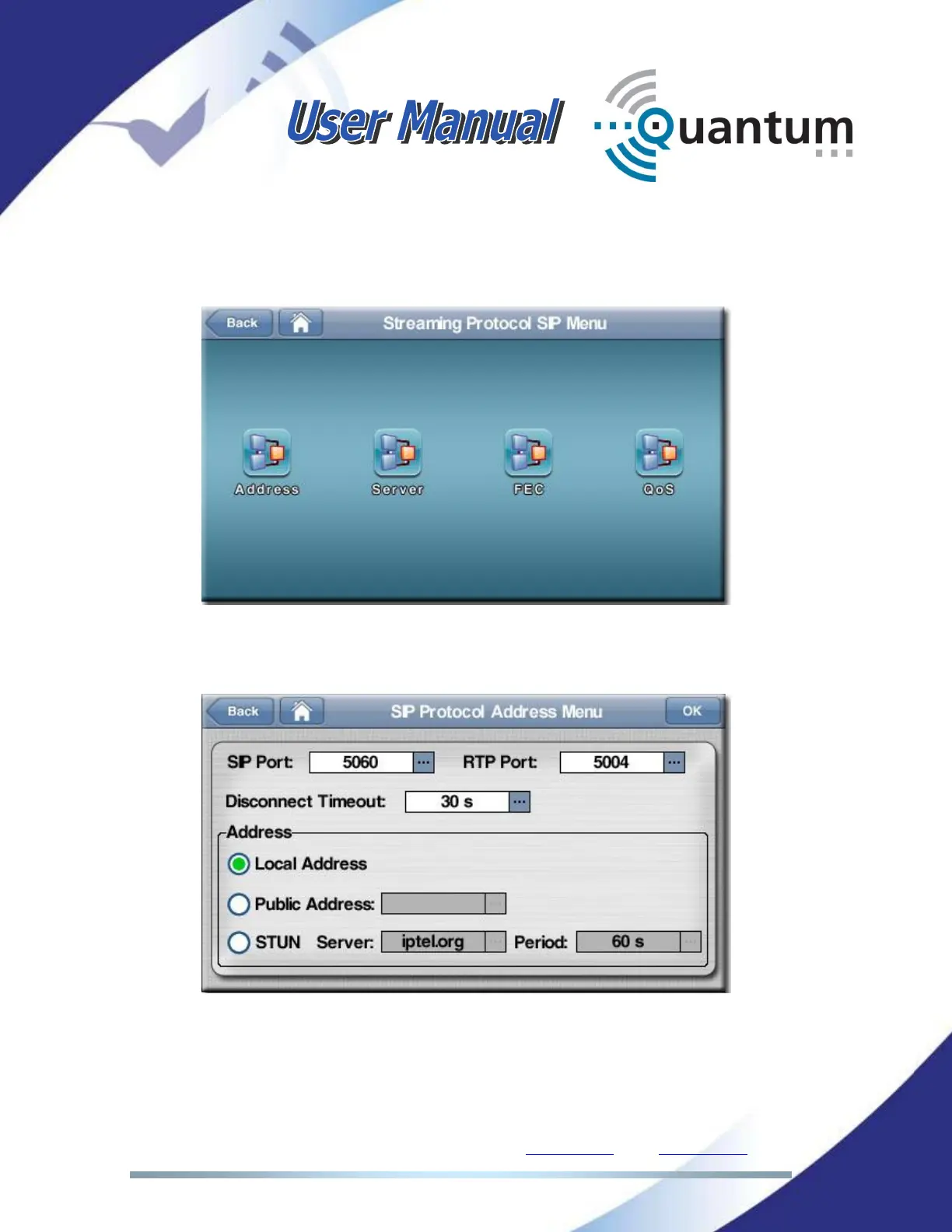 The SIP protocol address menu permits the configuration of the ports and the