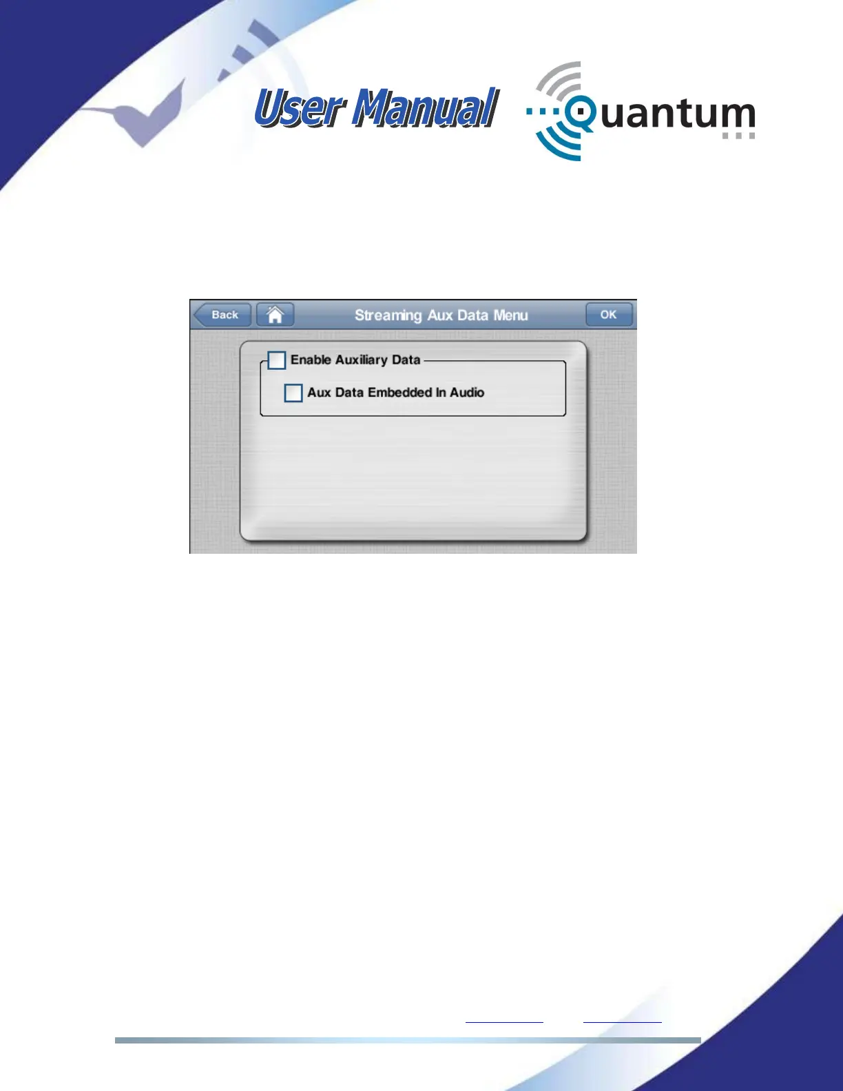 The Streaming Aux Data Menu allows establishing auxiliary data channels
