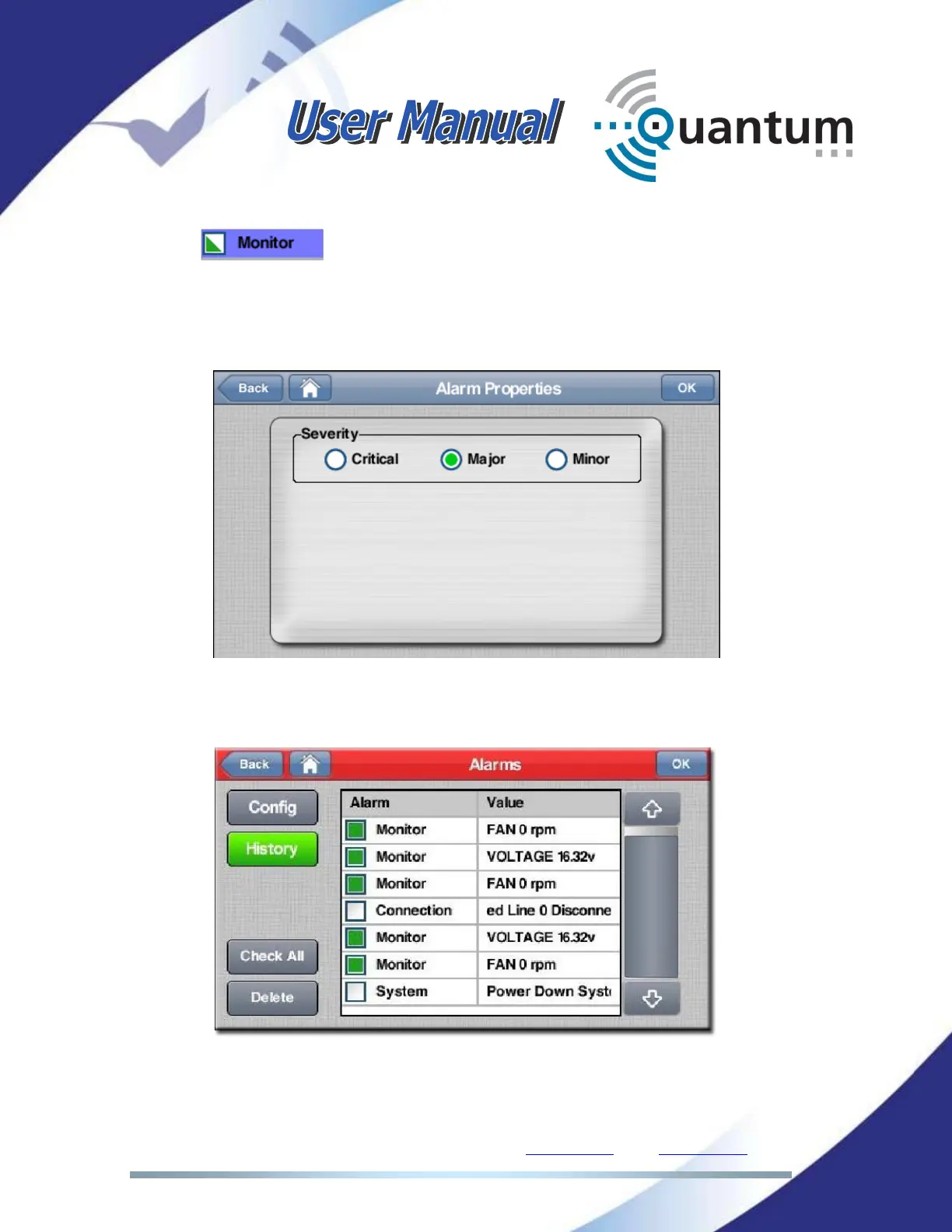 The alarm history submenu displays the alarm log as they happened.