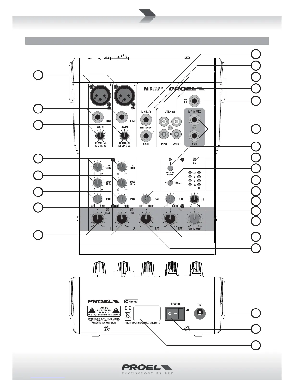 PROEL Mi6 - Control Panel and Features Overview; Front Panel Controls Description; Rear and Top Panel Connections