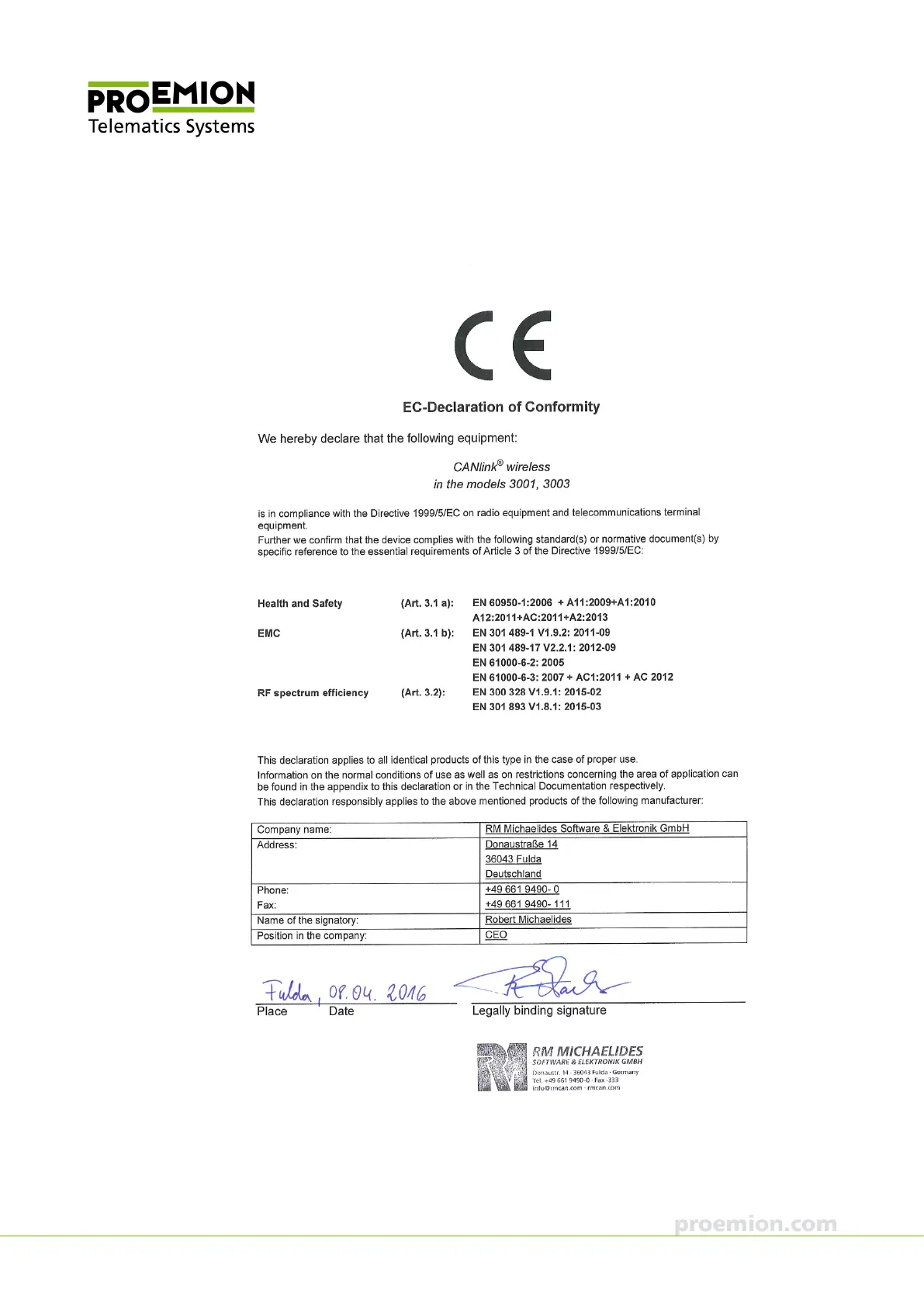 © 2016RM MICHAELIDES VX.X Device Manual CANlink 5000 series © 2016RM MICHAELIDES VX.X Device Manual CANlink 5000 series © 2016 PROEMION GMBH > 1.0 EN > Device Manual CANlink wireless 3000 series