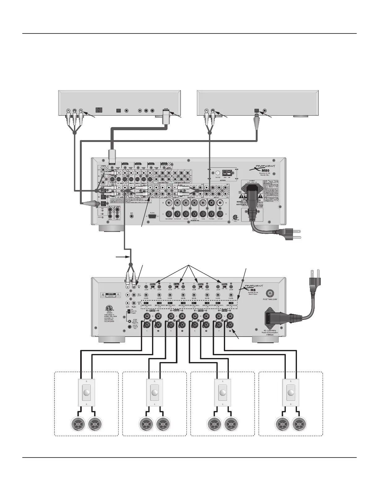 Diagram 126 shows the M80 Zone 2 OUT connected to the BUS IN in on a Procient M8 35 Watts X 8 channel amplier. This