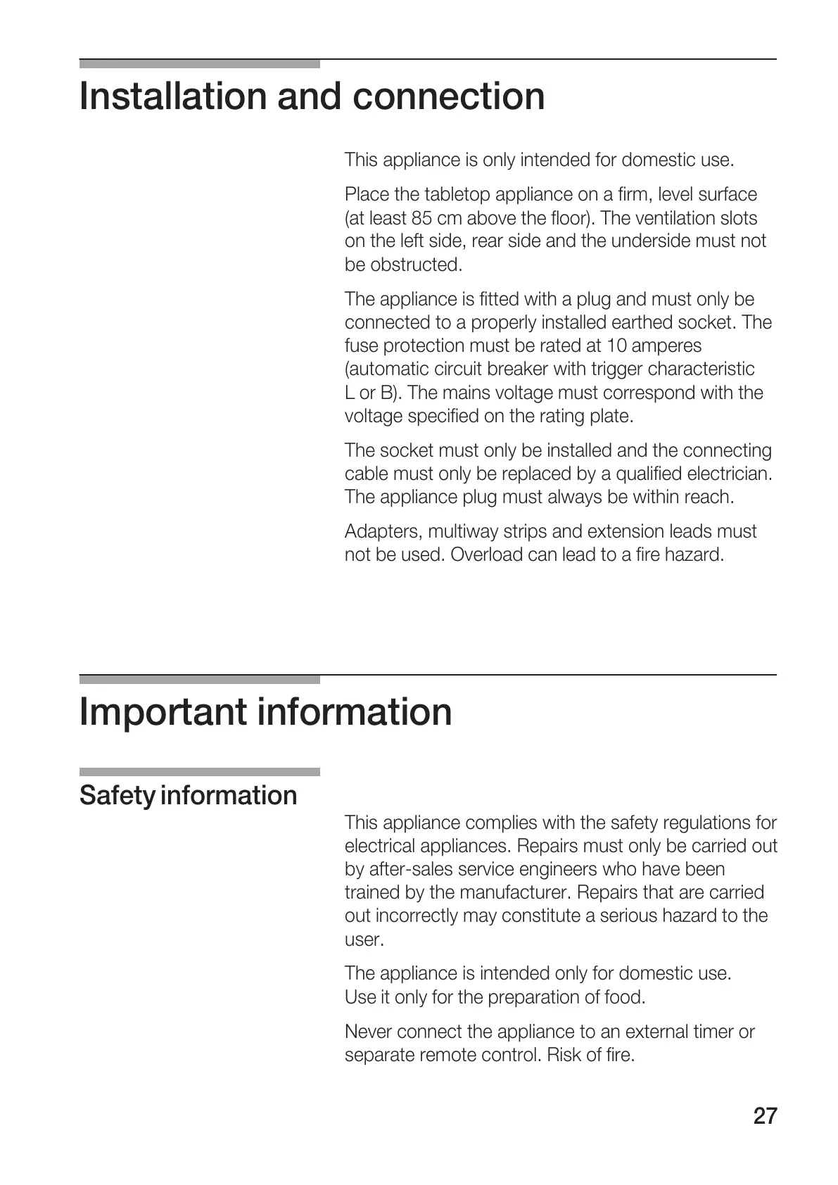 PROFILO MD1000 - Important Information; Installation and Connection; Safety Information