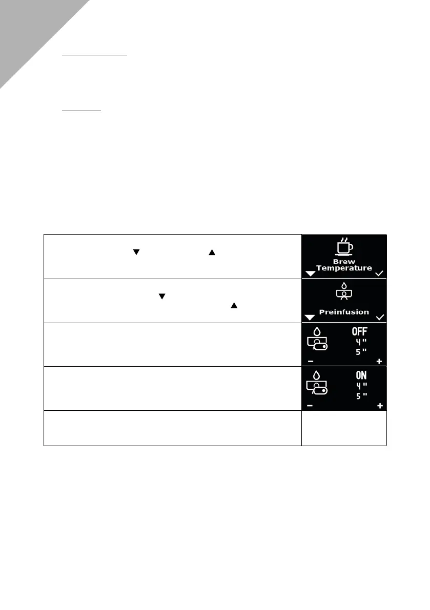 preinfusion can be switched on “ON“ or off ”OFF“ and changed.