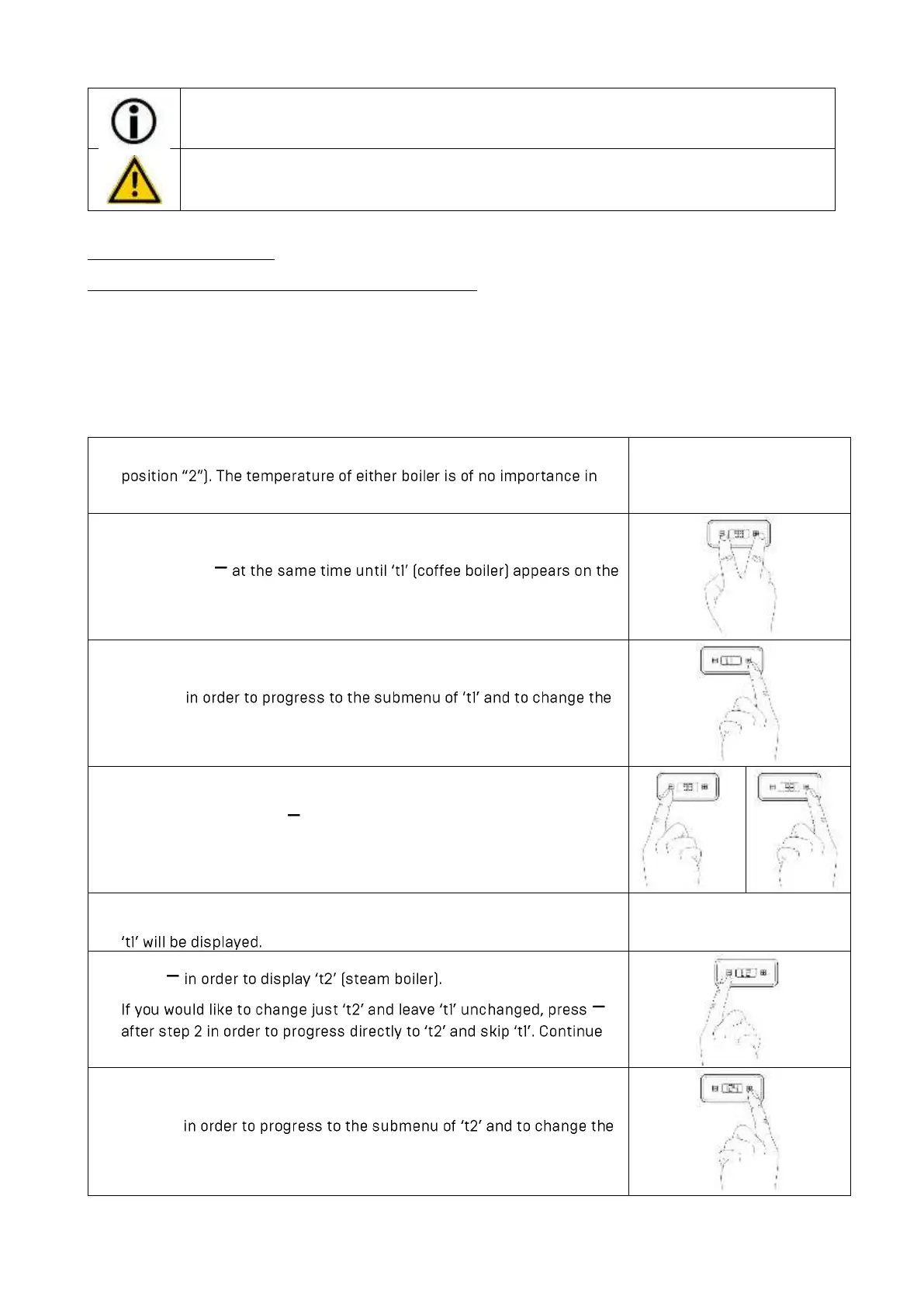 During normal operations the temperatures of the coffee boiler (t1, left dot on the display) and the steam