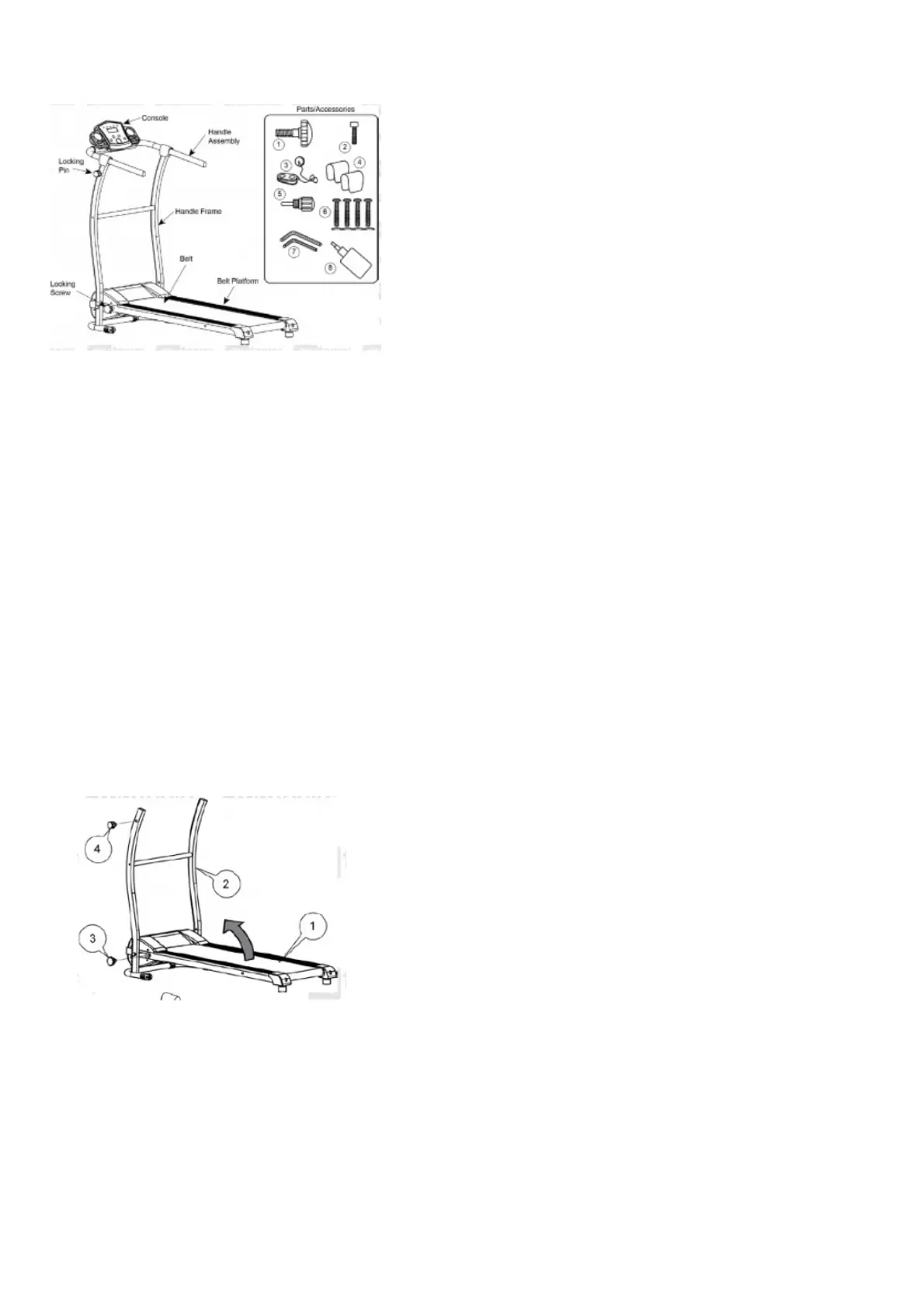 2. With the treadmill flat, lift the handle mounting frame ( 2) so that it is upright, then secure it to the belt platform ( 1) using the locking screw ( 3). Insert the