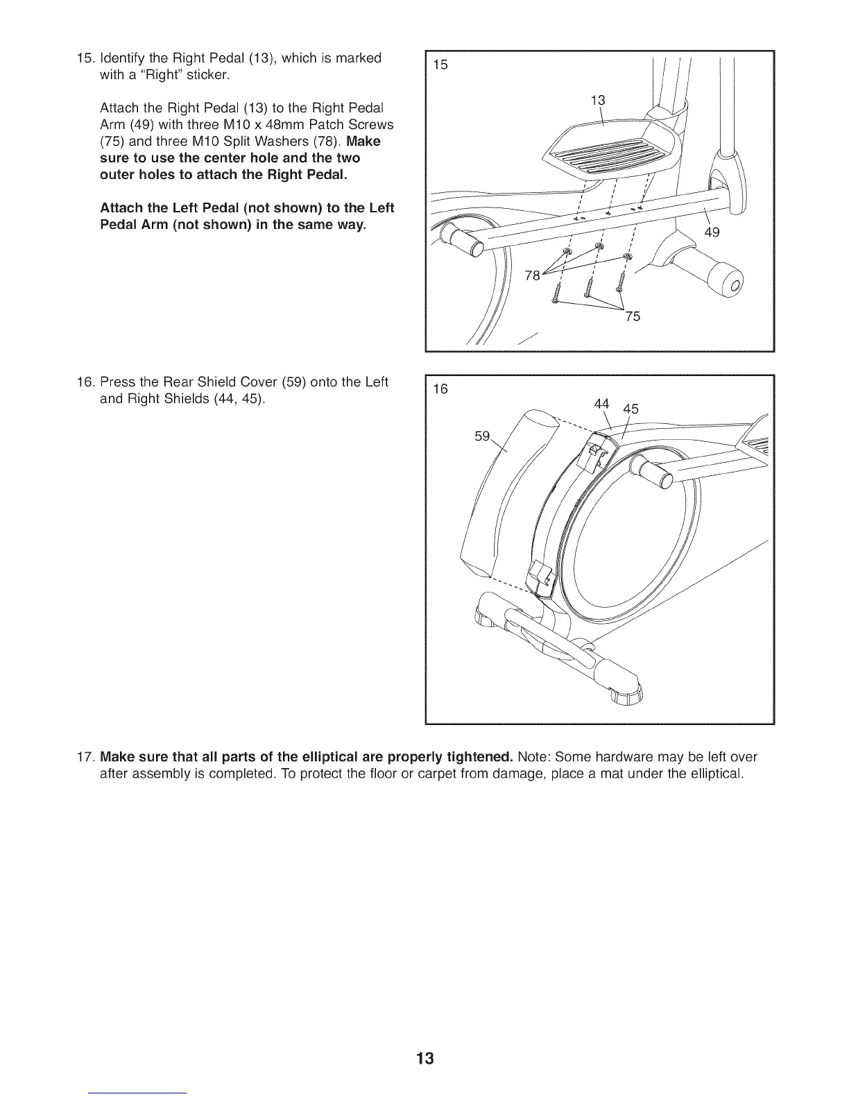 17. Make sure that all parts of the elliptical are properly tightened. Note: Some hardware may be left over