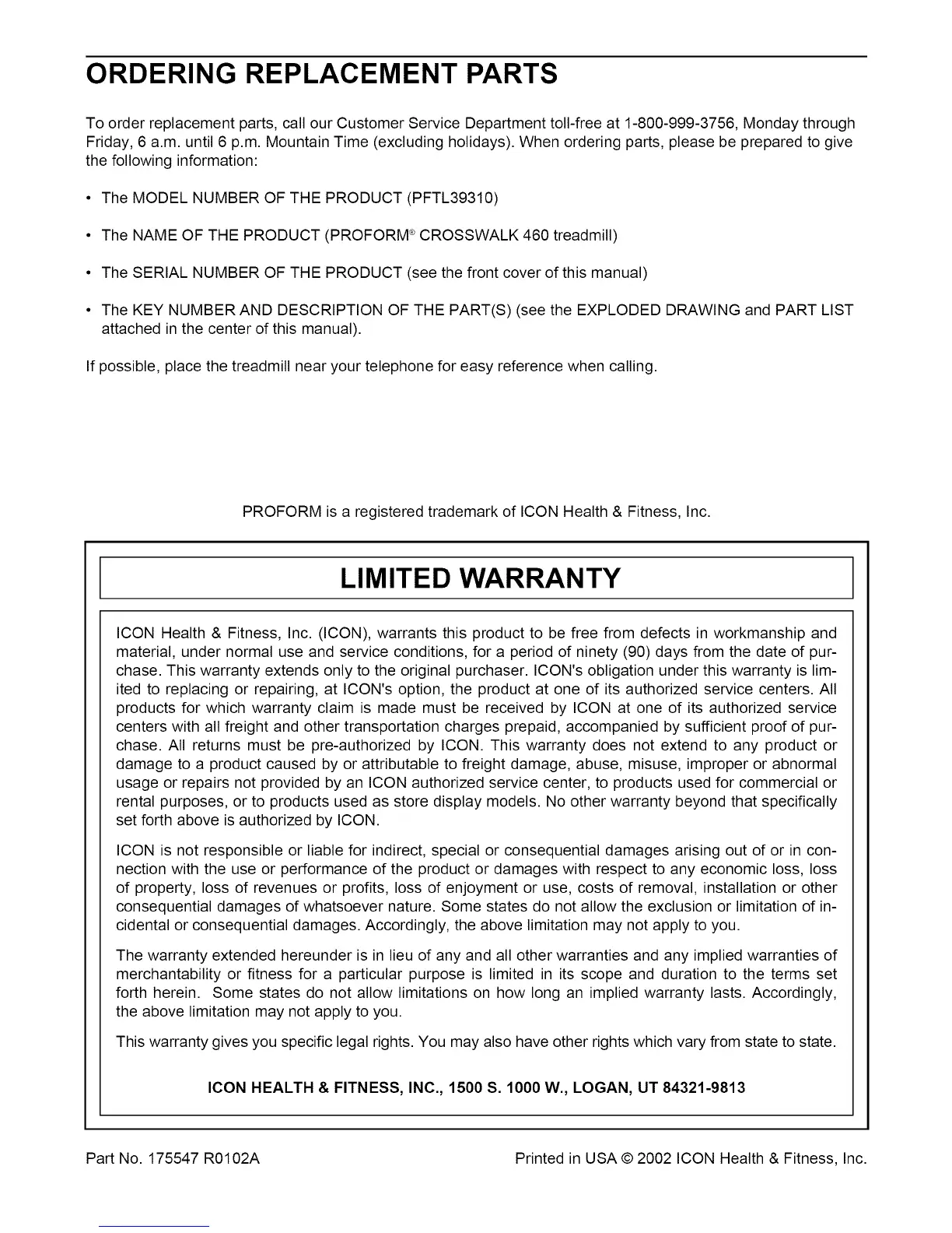 Part No. 175547 R0102A Printed in USA © 2002 ICON Health & Fitness, Inc.