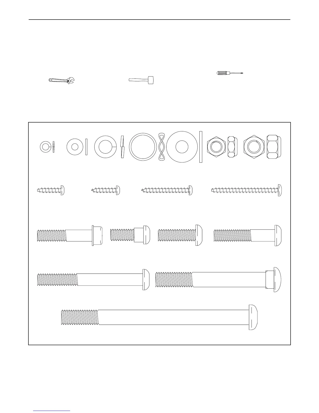 See the drawings below to identify the small parts needed for assembly. The number in parentheses below each