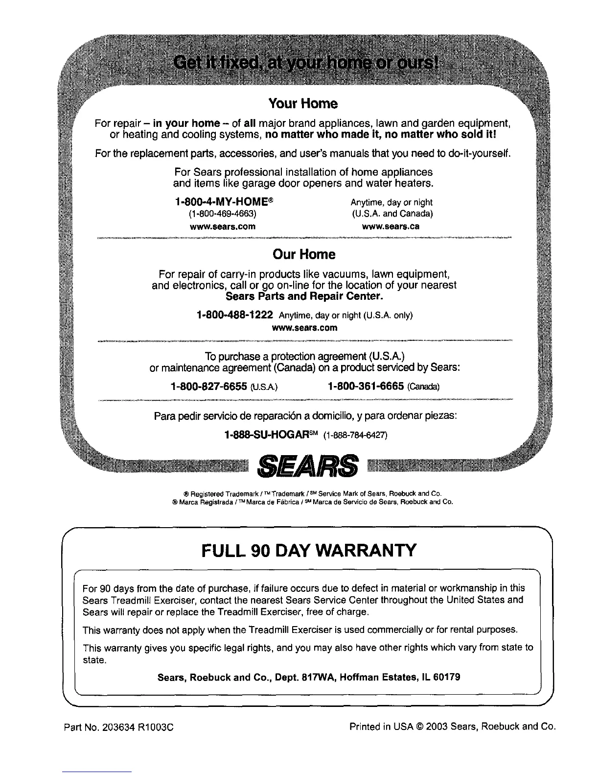 Sears Treadmill Exerciser, contact the nearest Sears Service Center throughout the United States and