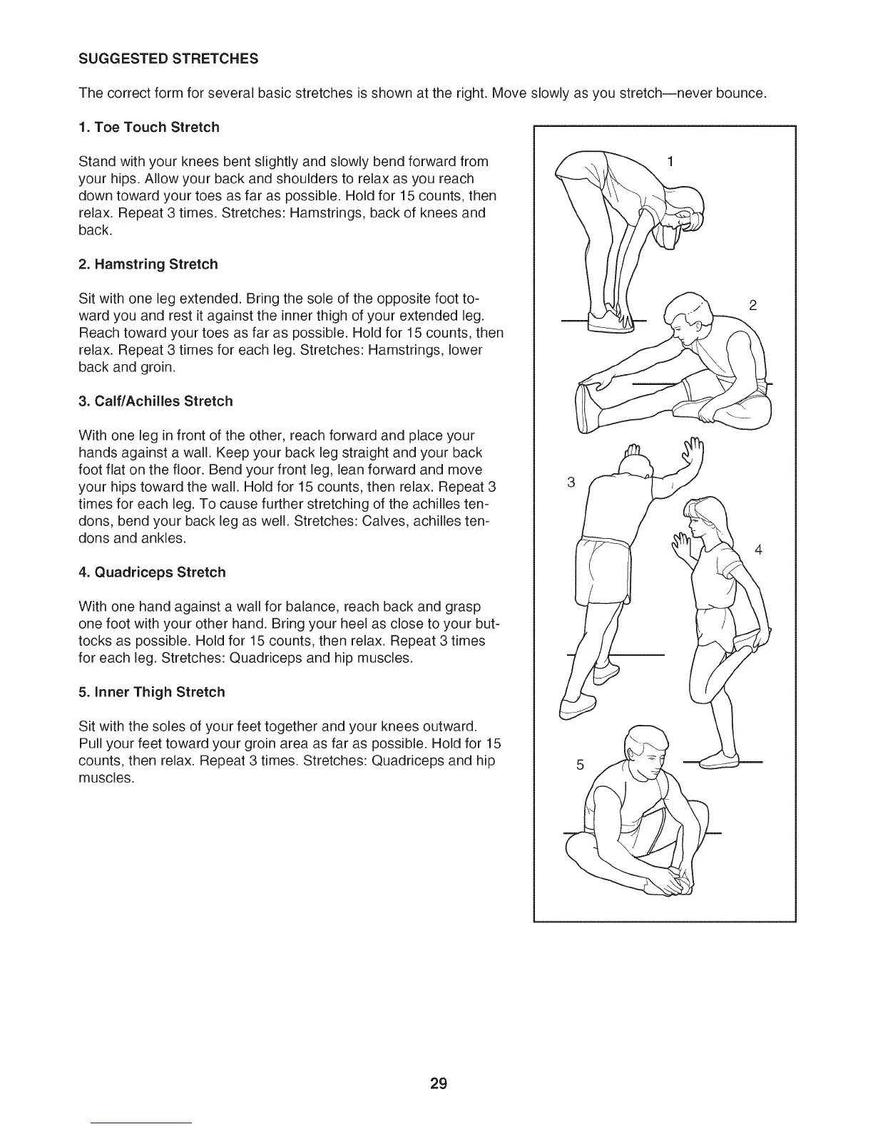 The correct form for several basic stretches is shown at the right. Move slowly as you stretch--never bounce.