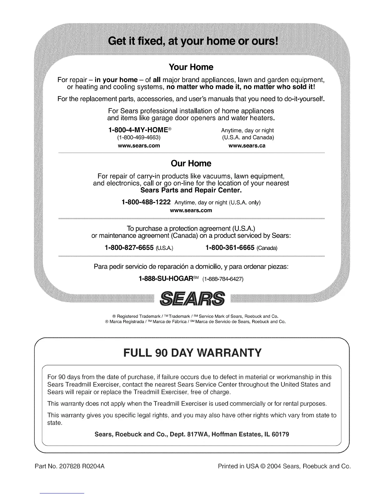 Sears Treadmill Exerciser, contact the nearest Sears Service Center throughout the United States and