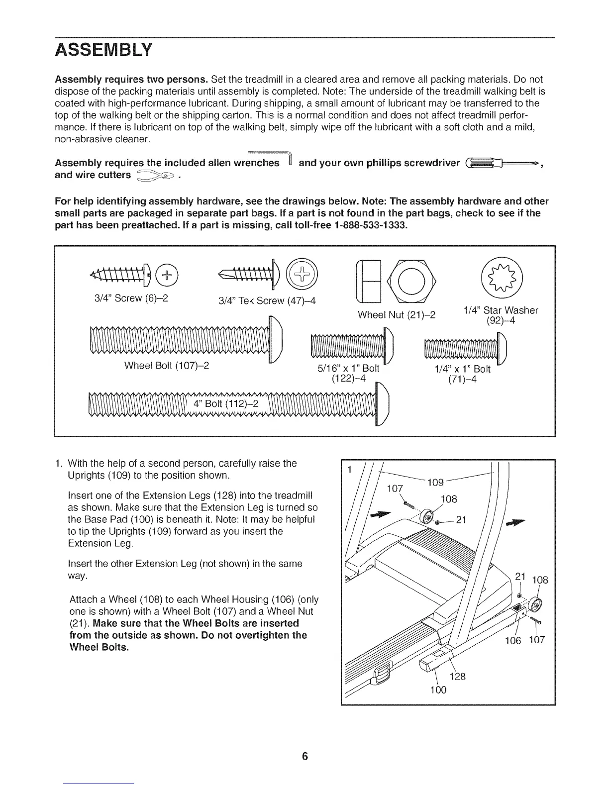 Assembly requires two persons. Set the treadmill in a cleared area and remove all packing materials. Do not