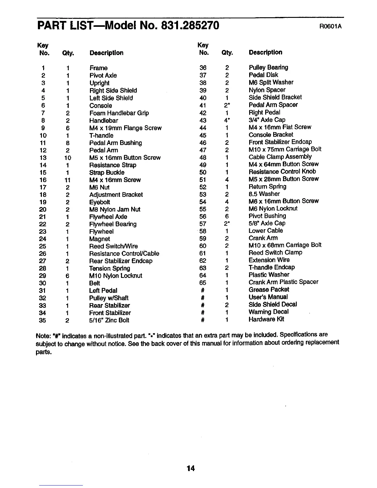 Note: "#" indicates a non-illustrated part. "," indicates that an extra part may be included. Specifications are