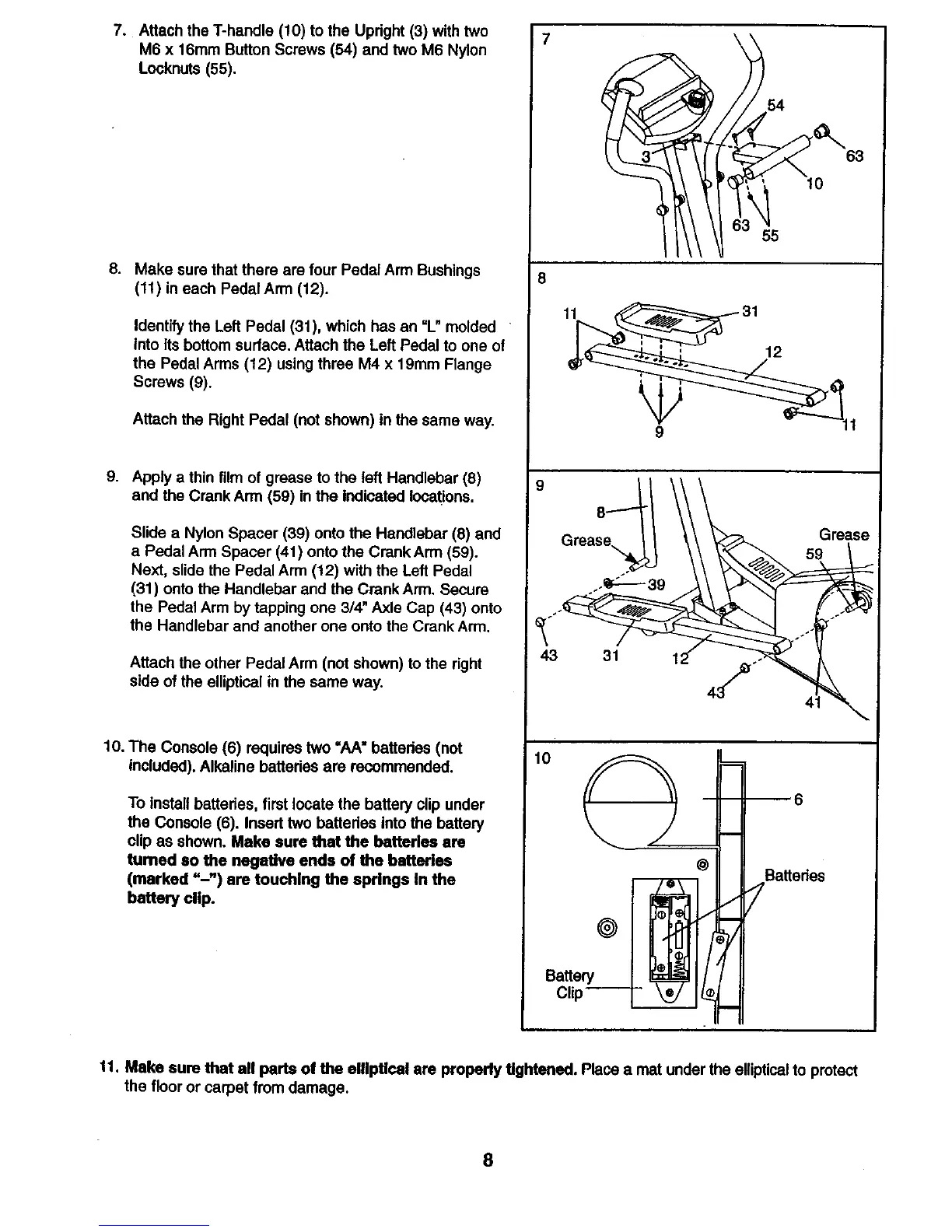 11. Make sure that all parts of the elliptical are propady tightened. Place a mat under the ellipticalto protect