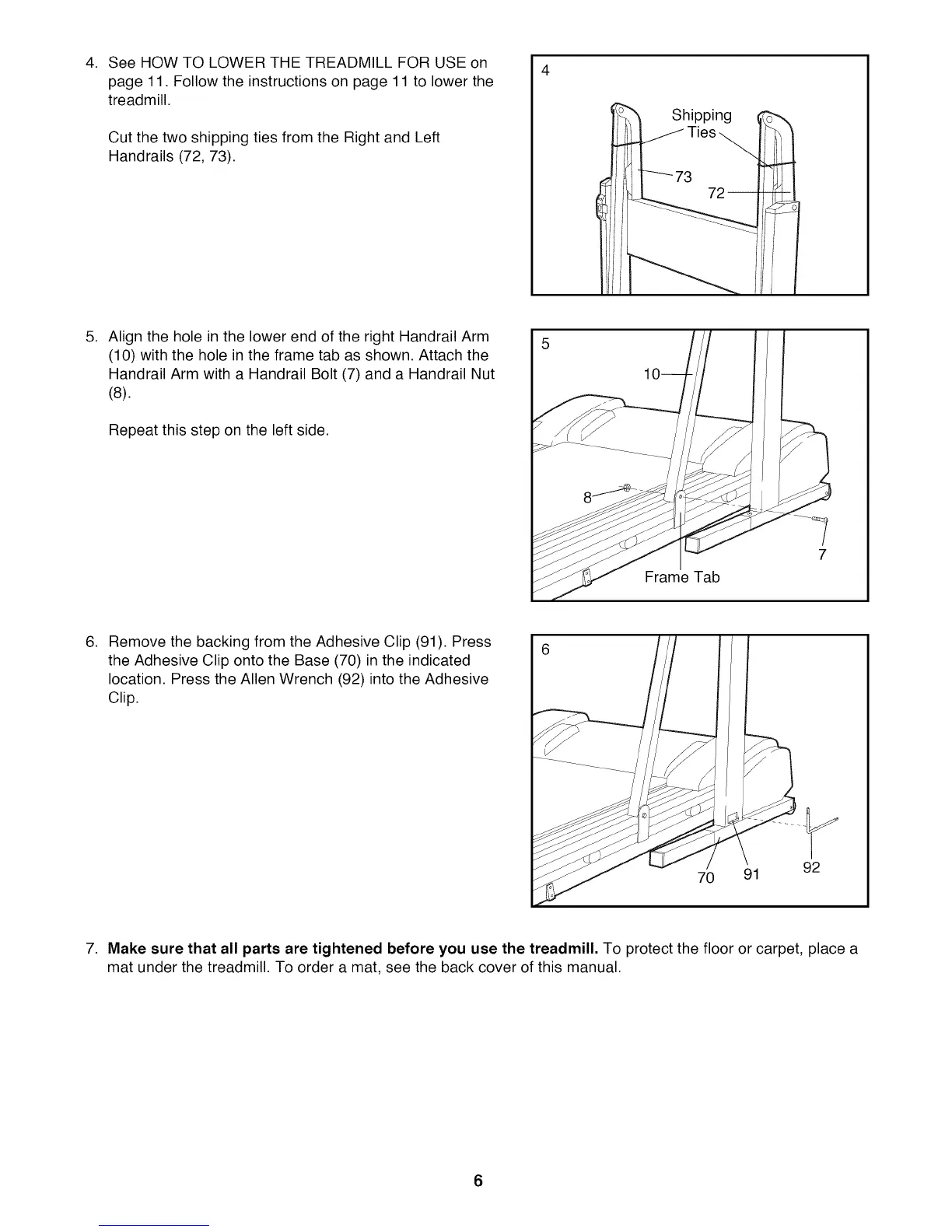 7. Make sure that all parts are tightened before you use the treadmill. To protect the floor or carpet, place a