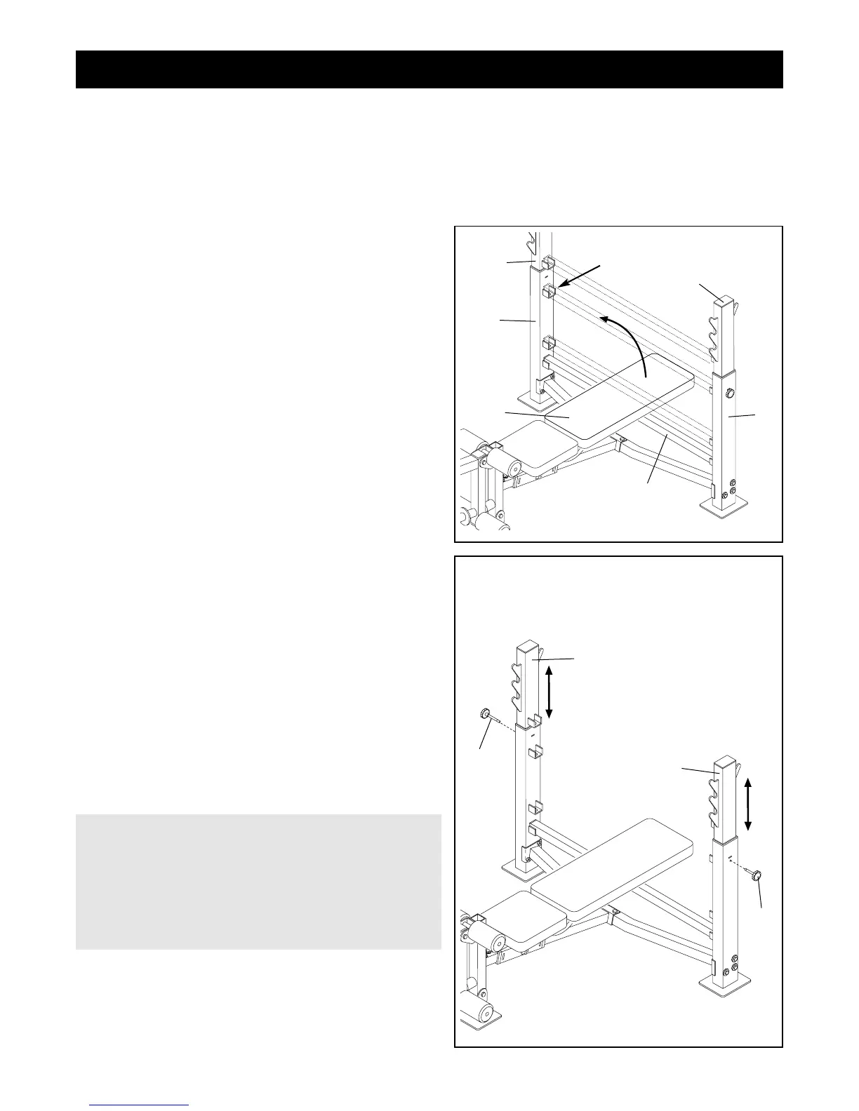 Inspect and tighten all parts each time you use the weight bench. Replace any worn parts immediately. The