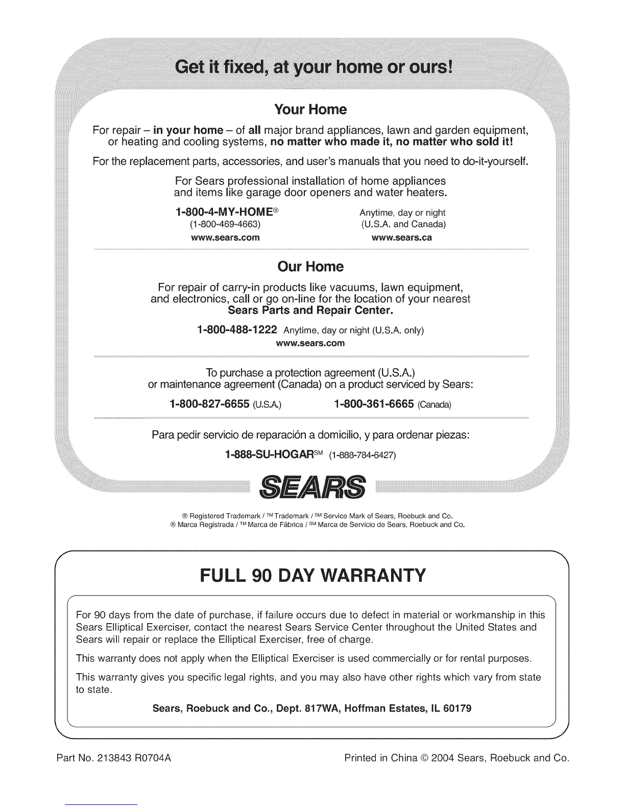 Sears Elliptical Exerciser, contact the nearest Sears Service Center throughout the United States and