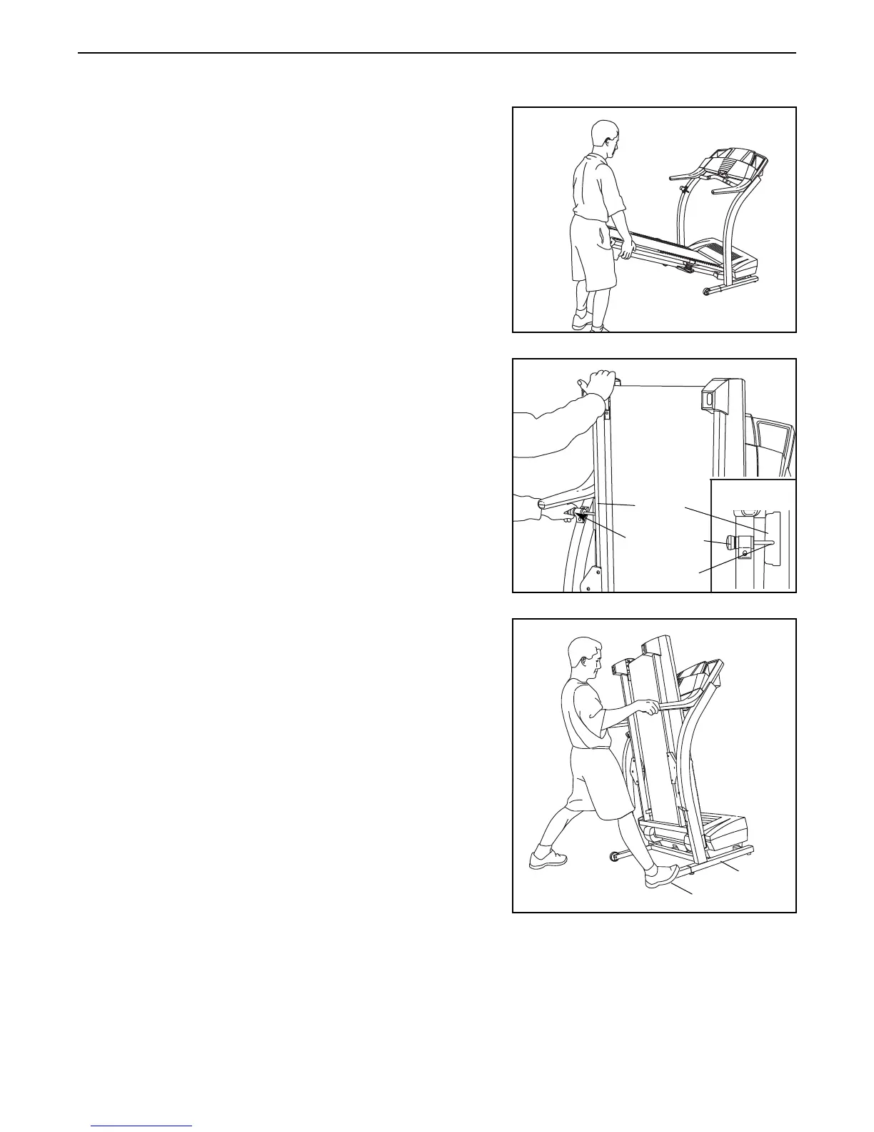 and hold it. Pivot the treadmill down until the frame is past the latch pin.