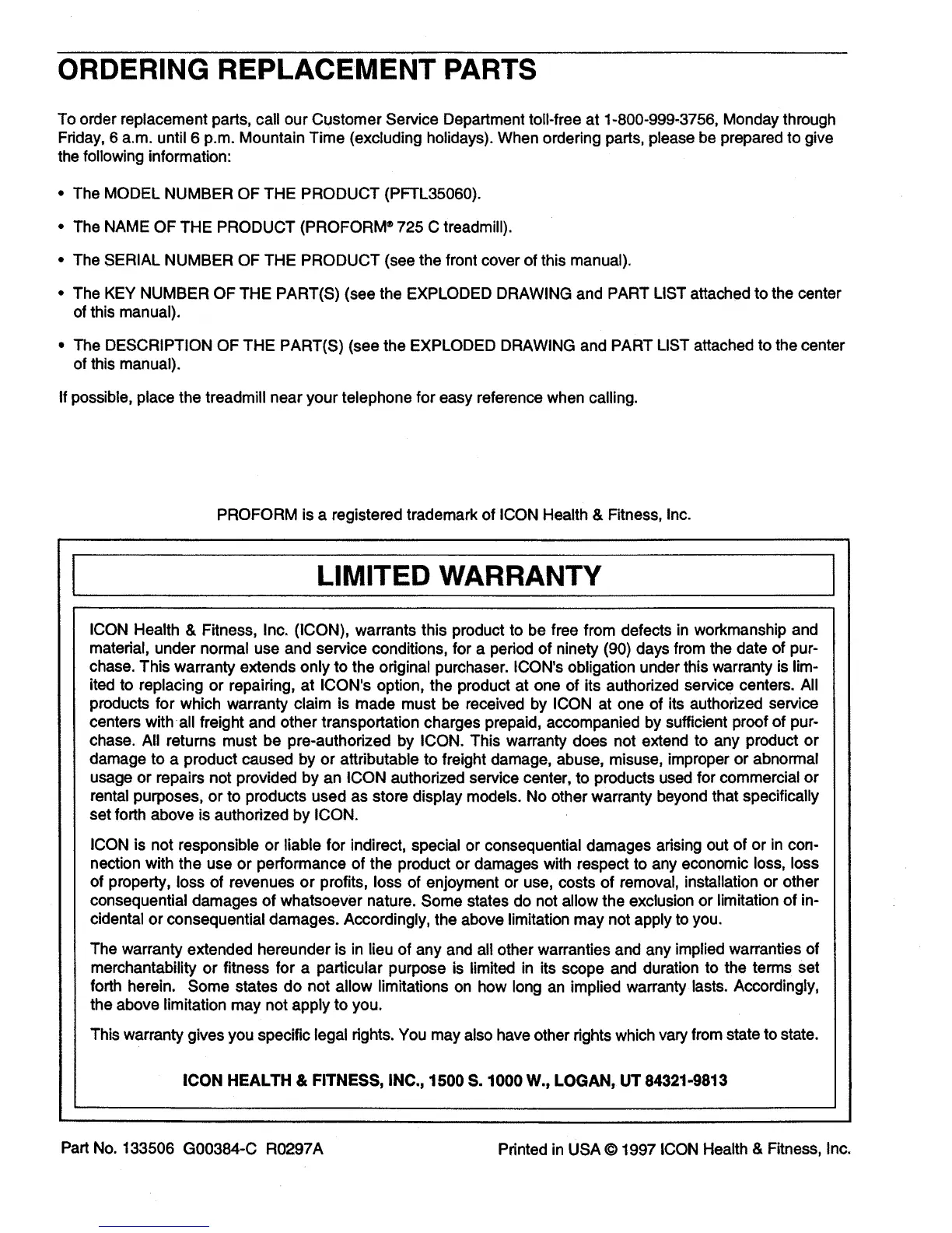 Part No. 133506 G00384-C R0297A Printed in USA © 1997 ICON Health & Fitness, Inc.