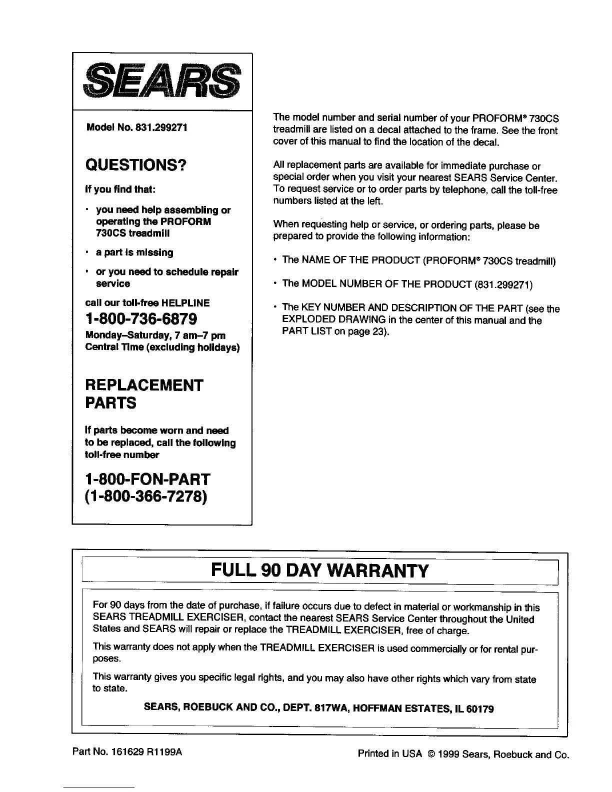Part No. 161629 R1199A Printed in USA © 1999 Sears, Roebuck and Co.