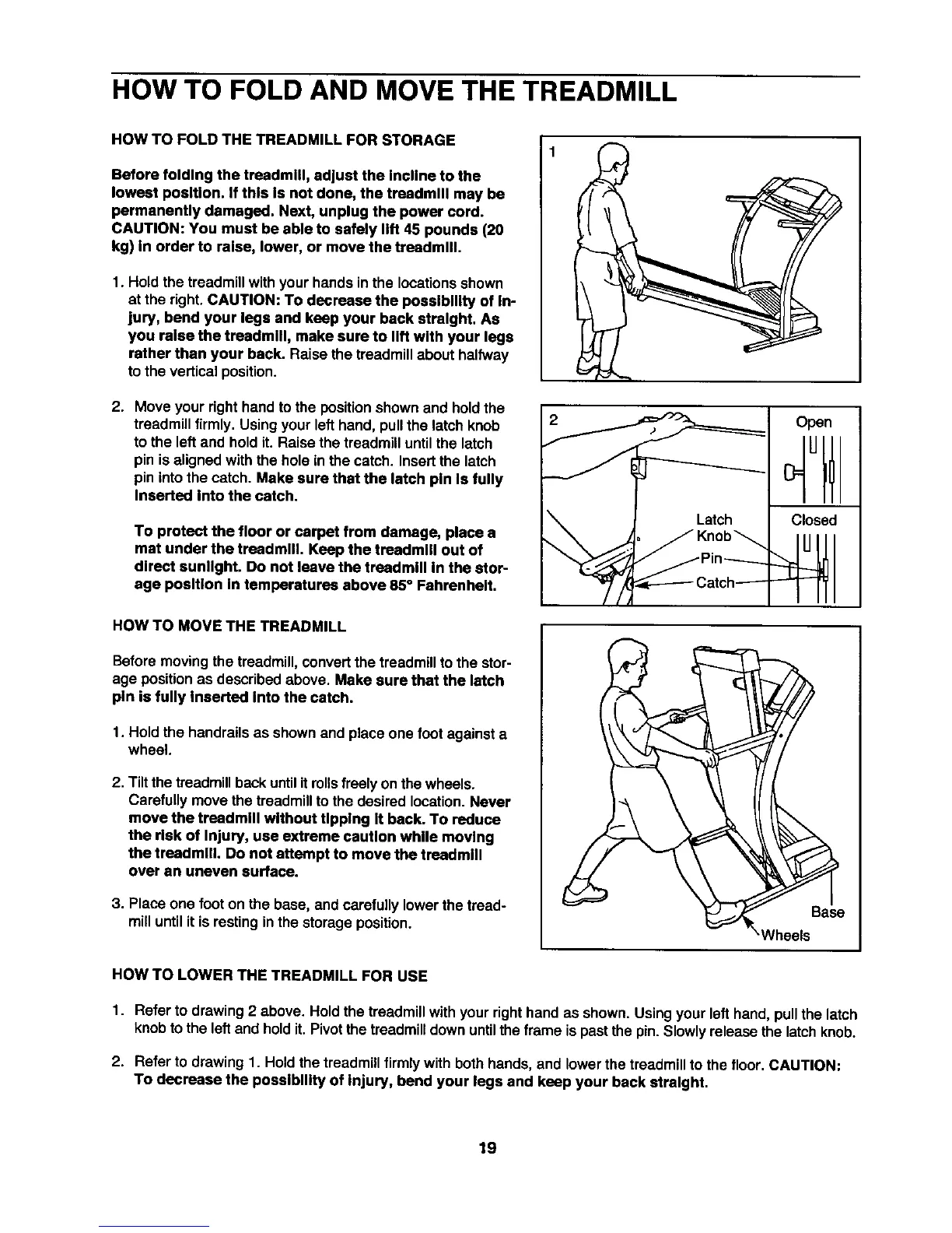 2. Refer to drawing 1. Hold the treadmill firmly with both hands, and lower the treadmill to the floor. CAUTION: