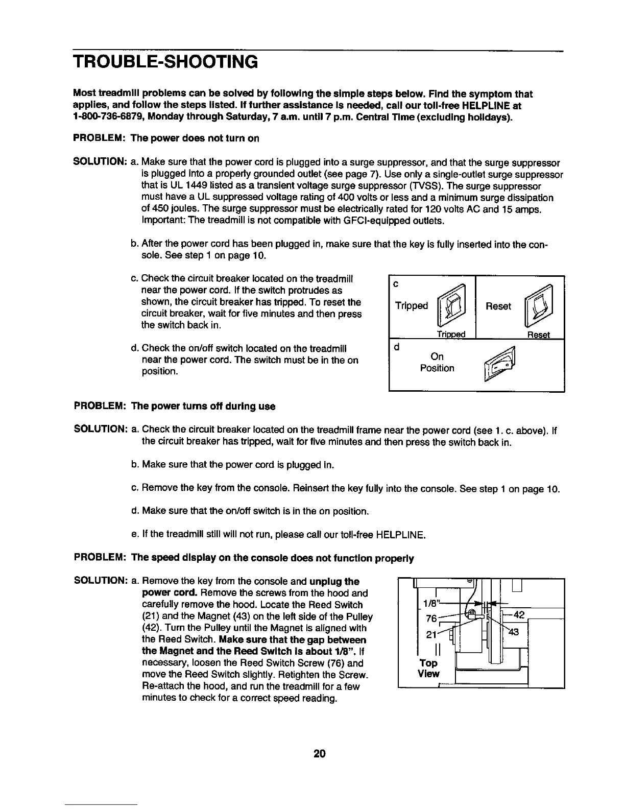 SOLUTION: a. Check the circuitbreaker located on the treadmillframe near the power cord (see 1. c. above). If