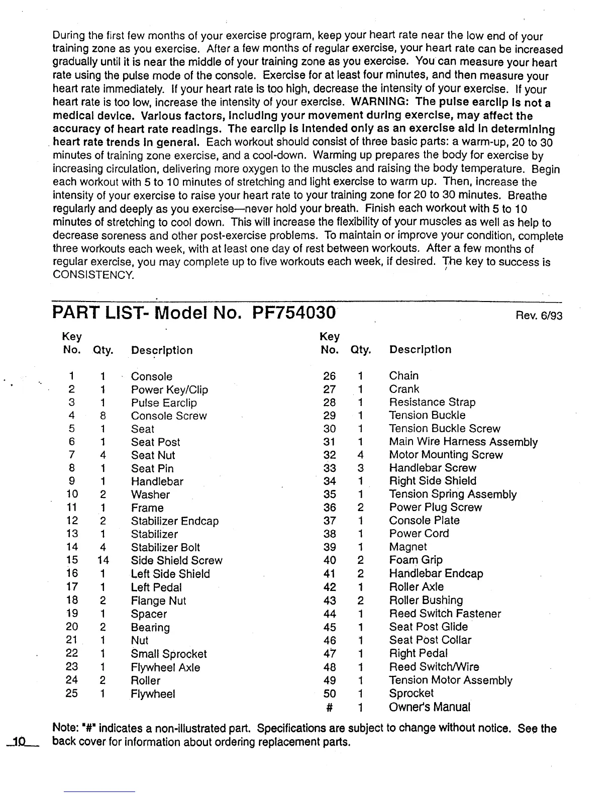 ProForm 754 - Exercise Progression and Consistency Advice; PART LIST; Component Identification by Key Number