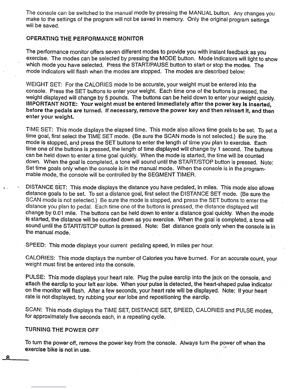 ProForm 754 - OPERATING THE PERFORMANCE MONITOR; Mode Selection and Performance Metrics; Turning the Exercise Bike Off