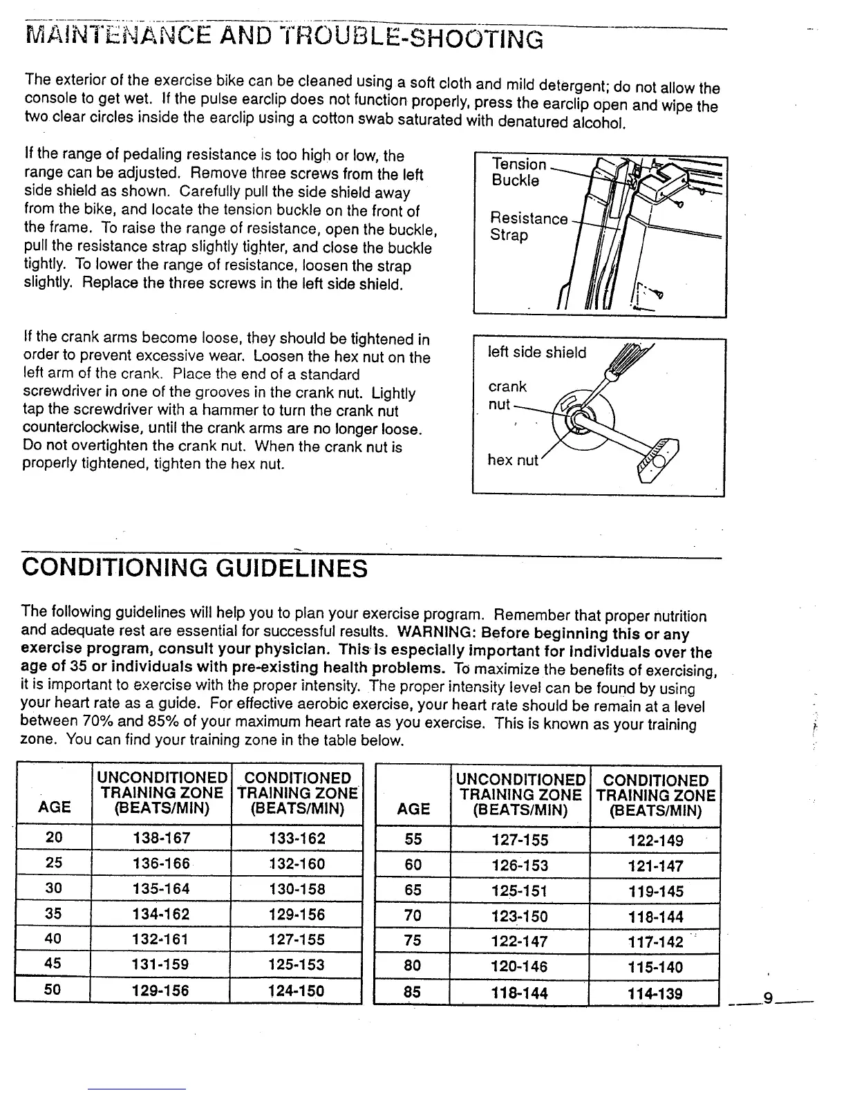 ProForm 754 - MAINTENANCE AND TROUBLE-SHOOTING; Cleaning, Earclip Fix, and Component Tightening; CONDITIONING GUIDELINES; Exercise Intensity and Training Zone Calculation