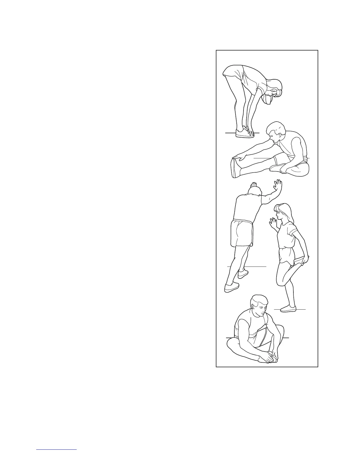 he correct form for several basic stretches is shown at the right. Move slowly as you stretch—never bounce.