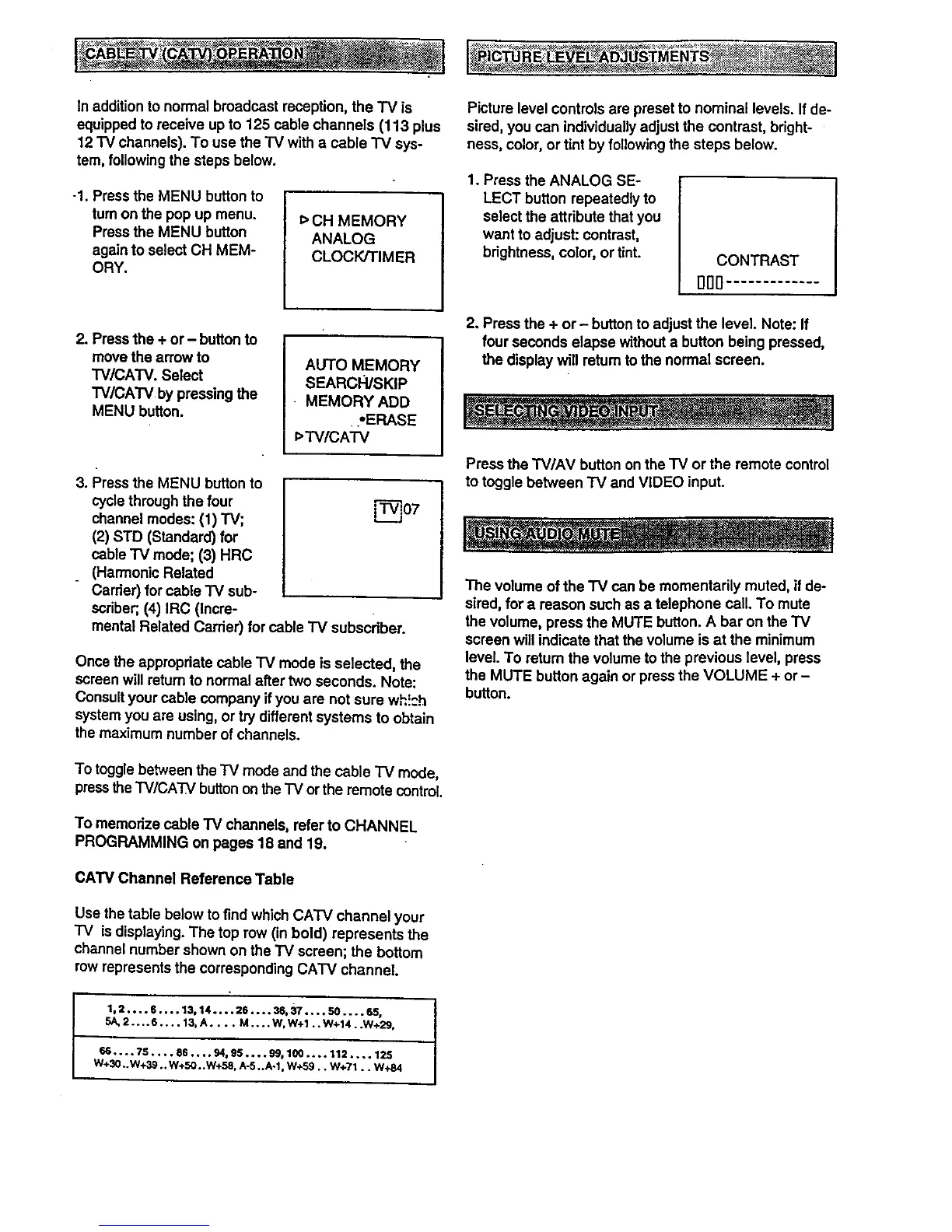 To memodze cable TV channels, refer to CHANNEL