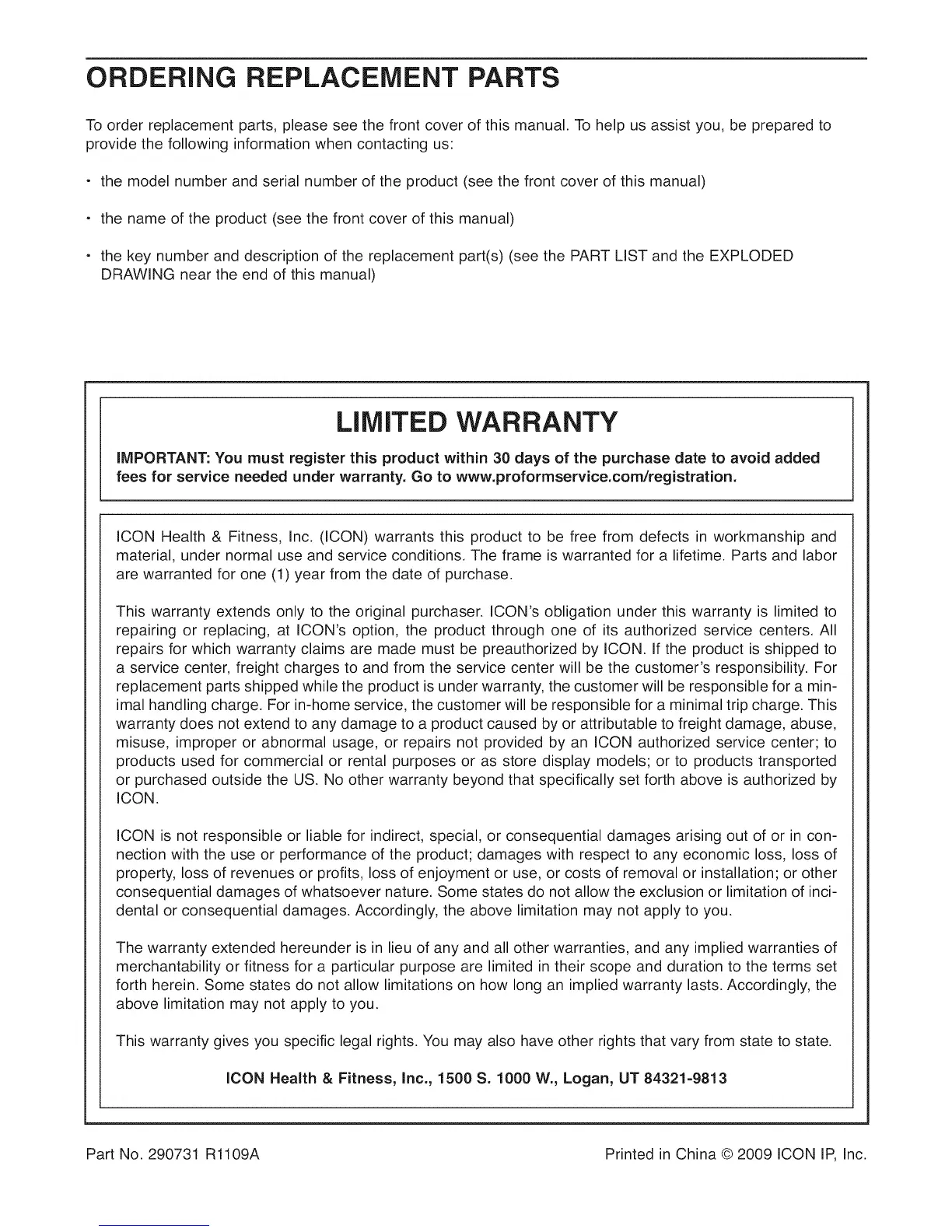 Part No. 290731 R1109A Printed in China © 2009 ICON IP, Inc.