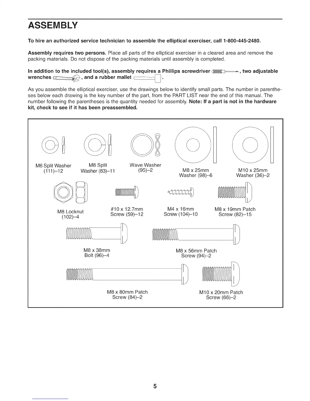 As you assemble the elliptical exerciser, use the drawings below to identify small parts. The number in parenthe-