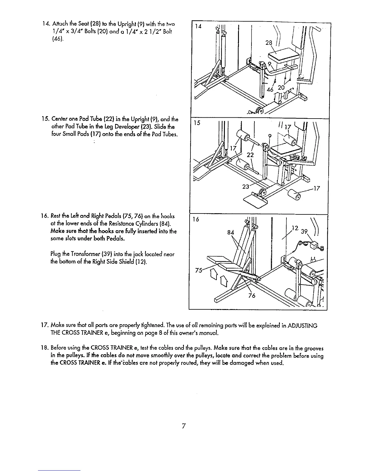 18. Before using the CROSS TRAINER e, test the cables and thepulleys. Make sure that the cables are in the grooves
