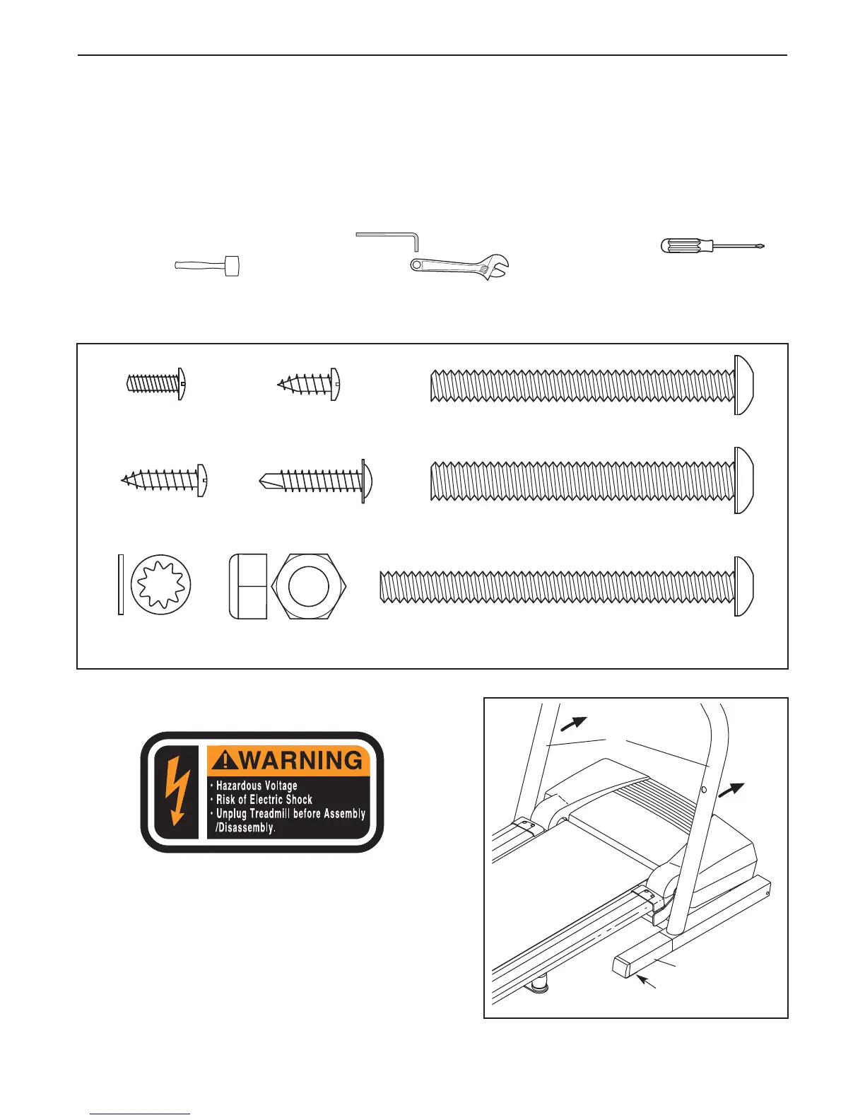 Assembly requires two persons. Set the treadmill in a cleared area and remove all packing materials. Do not