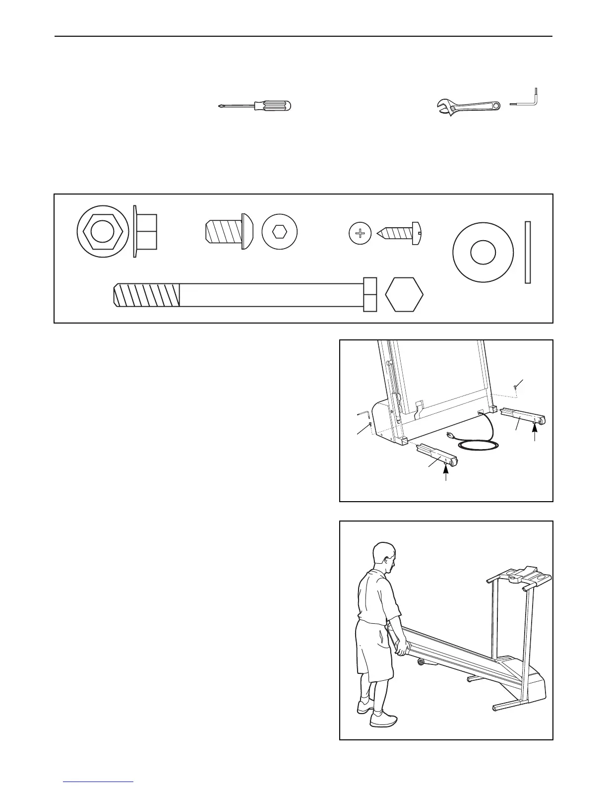 Assembly requires two people. Set the treadmill in a cleared area and remove all packing materials. Do not