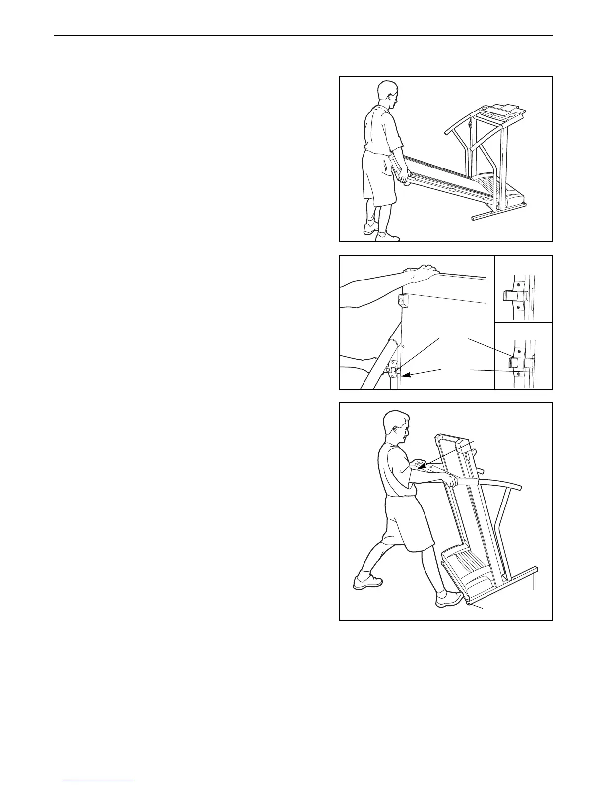 thumb, slide the storage latch to the left and hold it. Pivot the treadmill down until the frame is past the storage