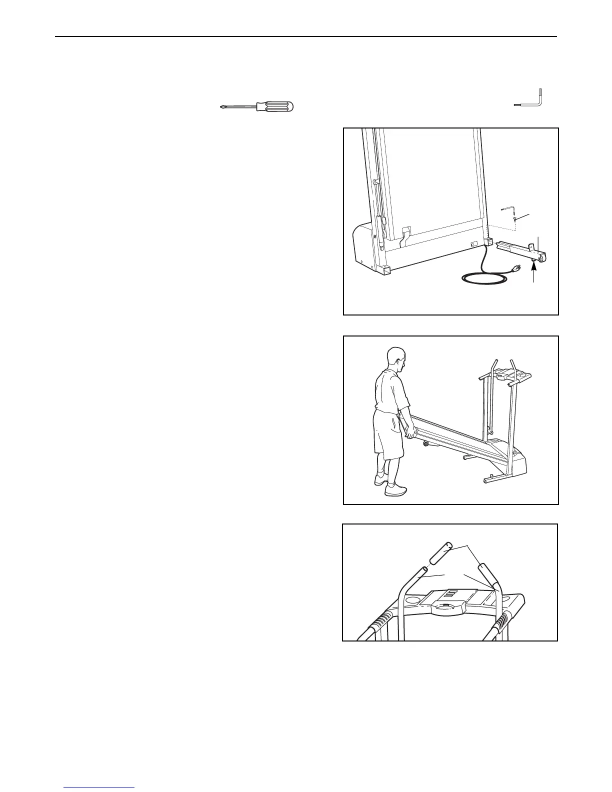 Assembly requires two people. Set the treadmill in a cleared area and remove all packing materials. Do not