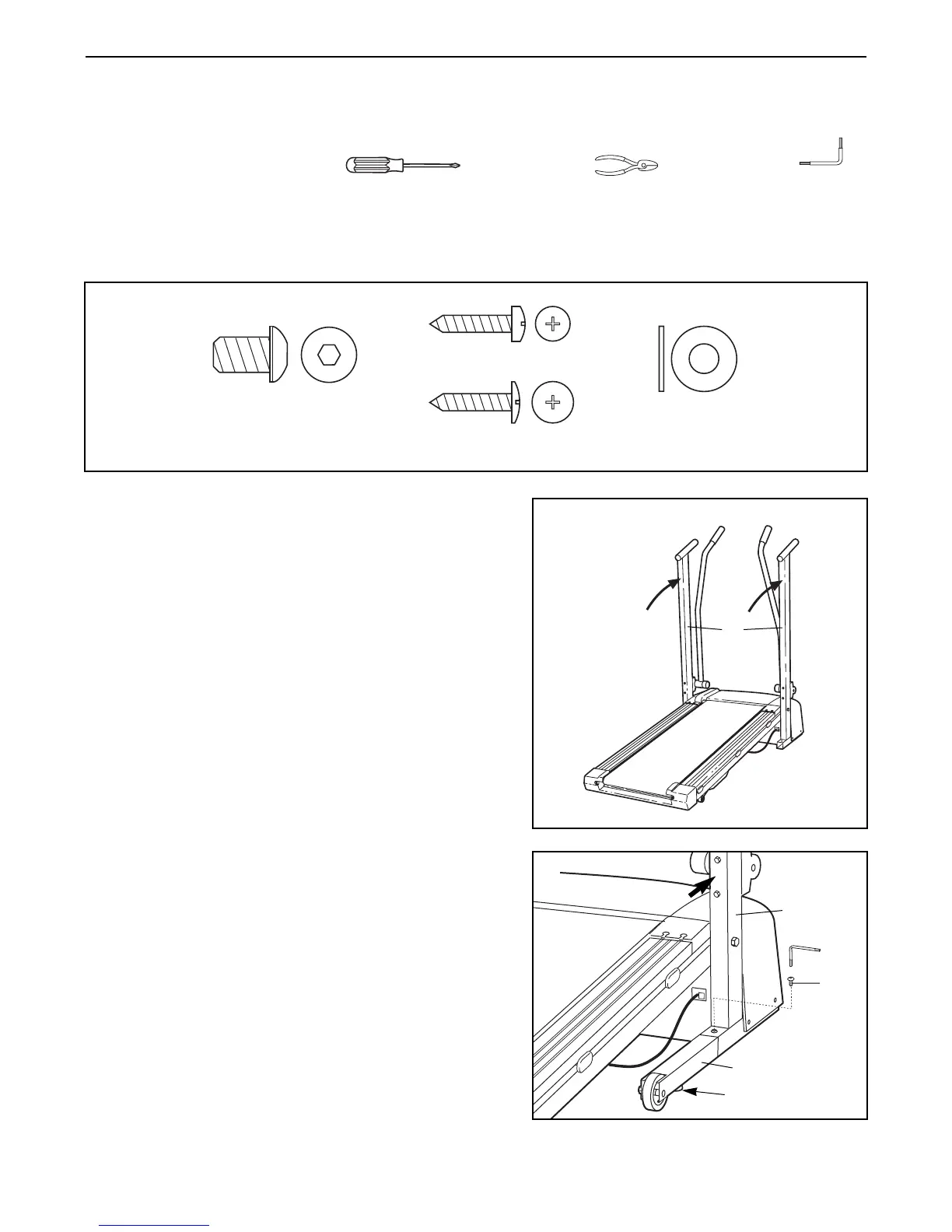 Assembly requires two people. Set the treadmill in a cleared area and remove all packing materials. Do not